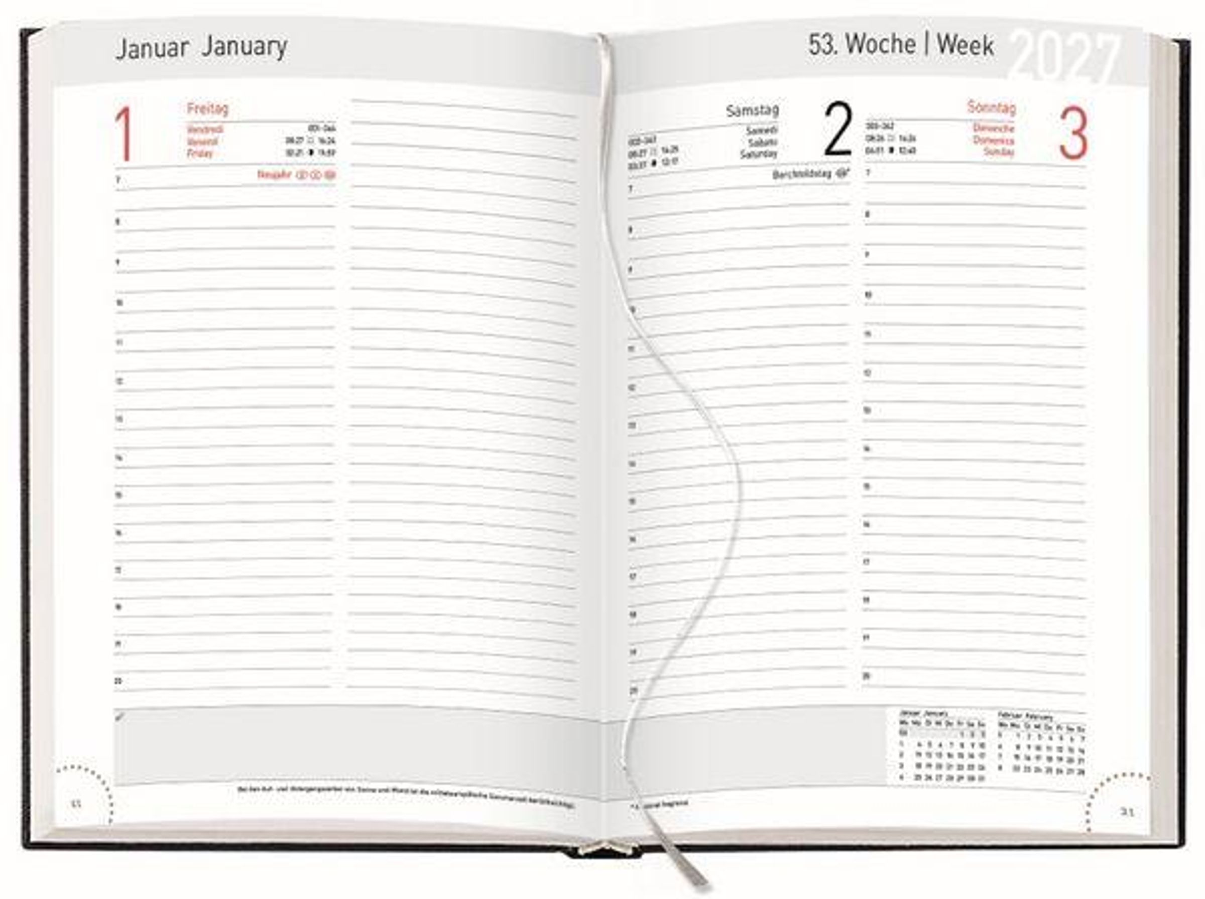 - Extras: Jahresübersicht 2027 / 28, Platz für Notizen, Infoseiten rund um geschäftliche Themen
