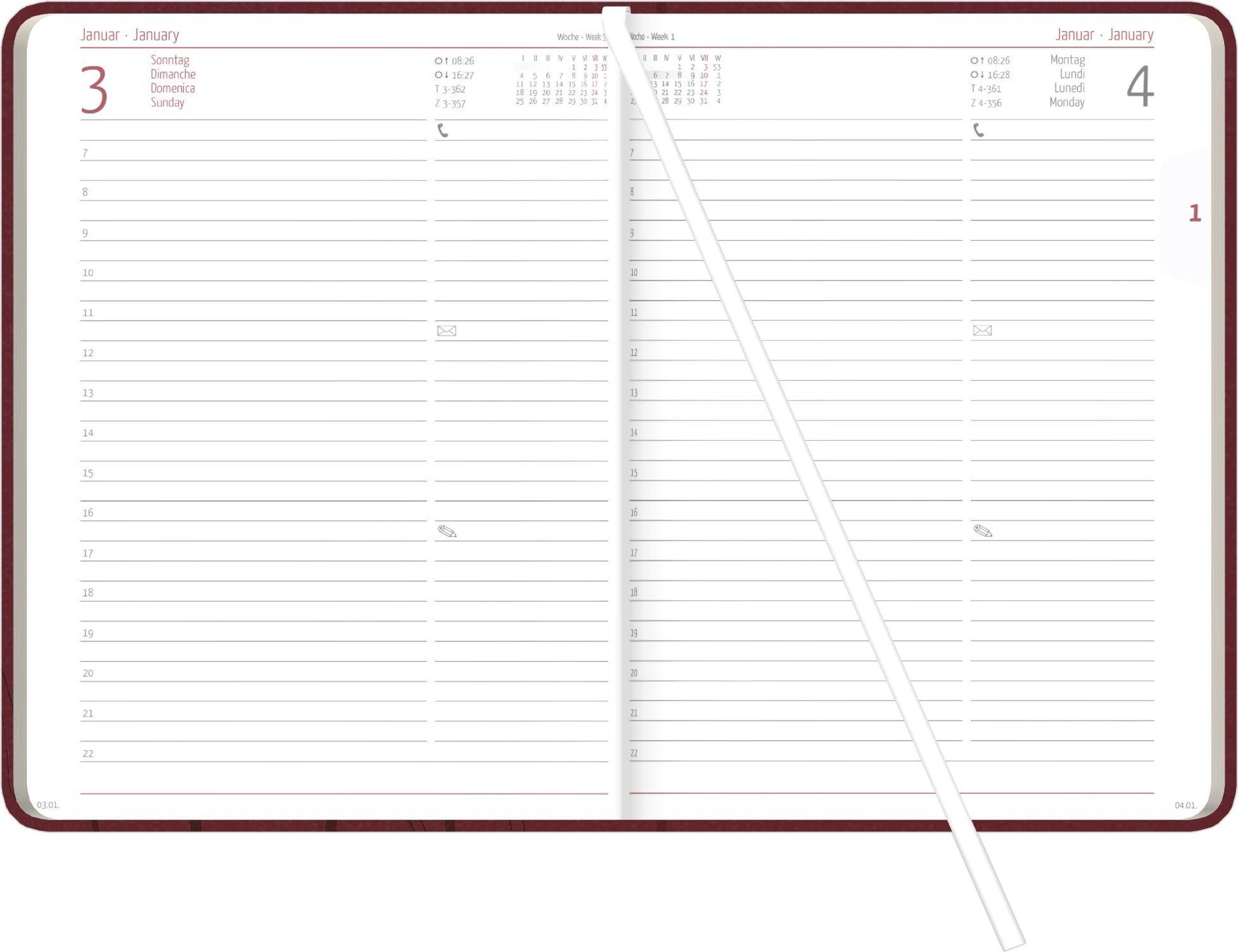 - Gebunden, Lesebändchen, 1 Tag = 1 Seite, gerundete Ecken am Block und Einband, Eckenperforation