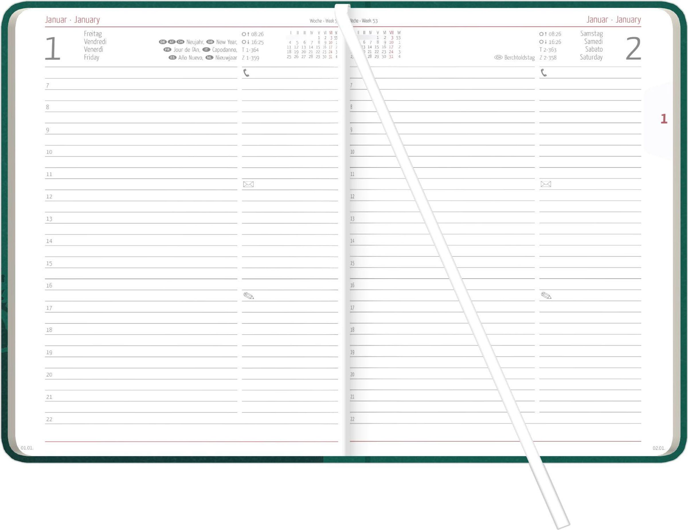 Durchdachte Extras: Monatsregister, Leseband, Eckenperforation, zahlreiche Zusatzinfos (Ferientermine, Pollenflugkalender, Postentgelte)