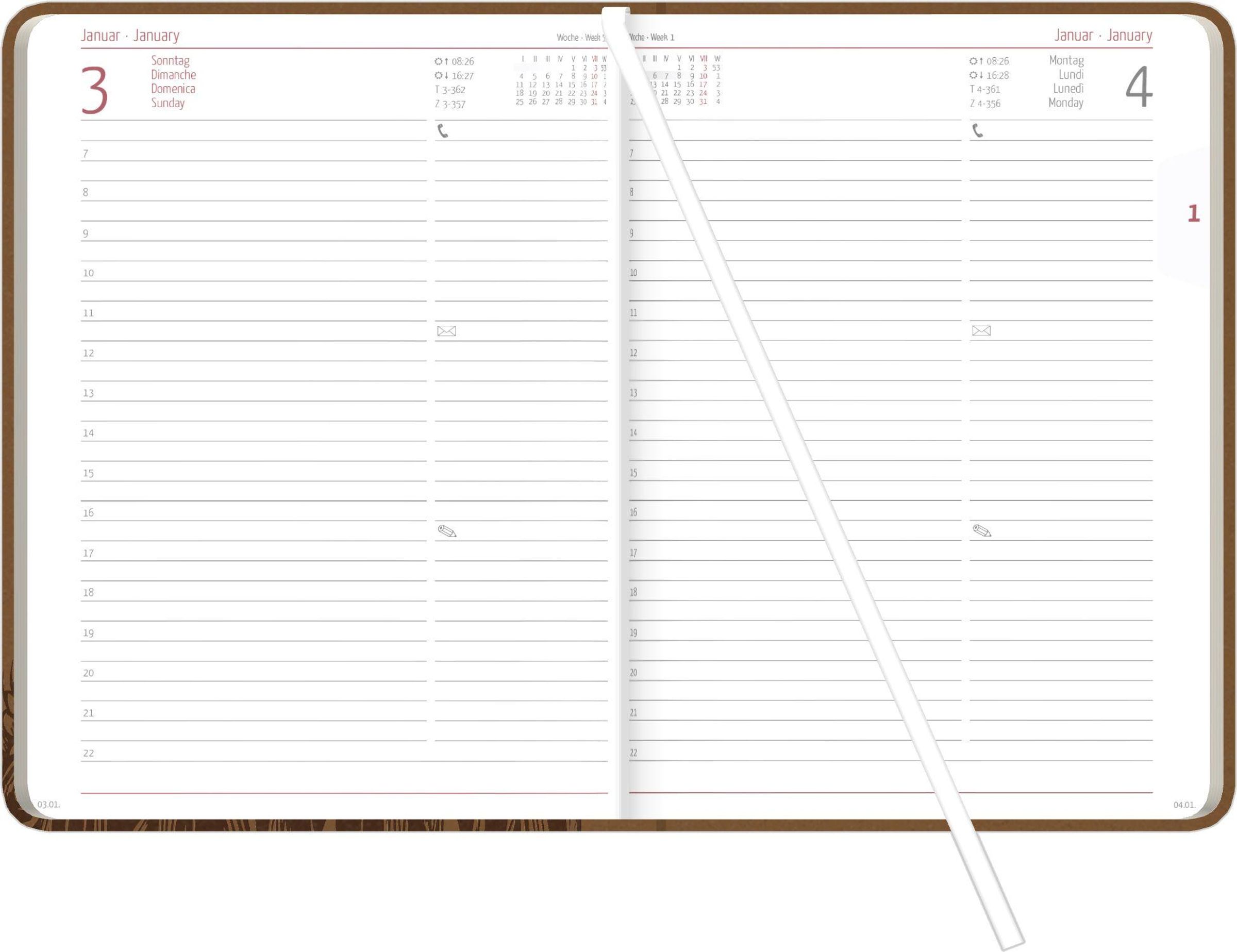 Maximale Übersicht: 416 Seiten -- 1 Tag pro Seite mit Zeiteinteilung 7--22 Uhr und großzügigem Notizbereich
