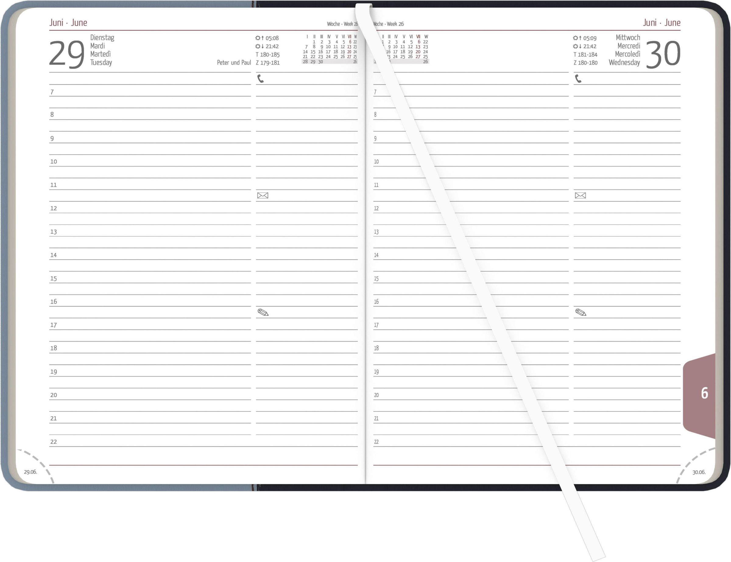 Kalendarium: 1 Tag pro Seite mit Uhrzeiteinteilung 7--22 Uhr, viersprachig (DE/FR/IT/GB)