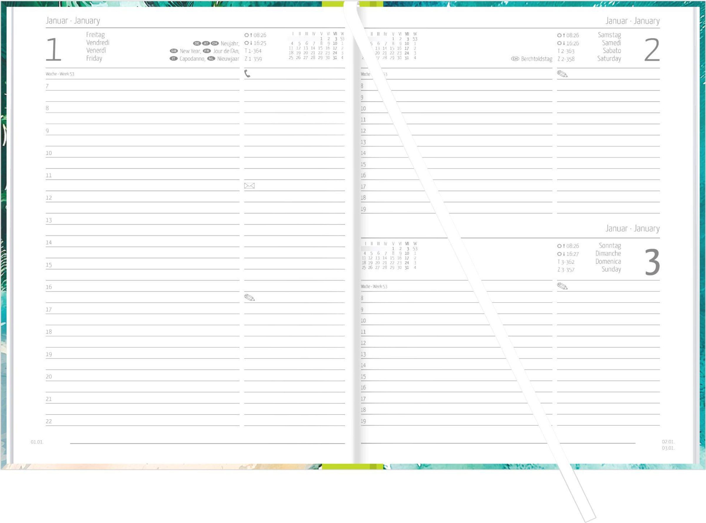 Durchdachte Extras: Leseband, Eckenperforation, Ferientermine, Pollenflugkalender, Postentgelte, Telefonvorwahlen, wichtige Internetadressen, Platz für Kontakte & Notizen