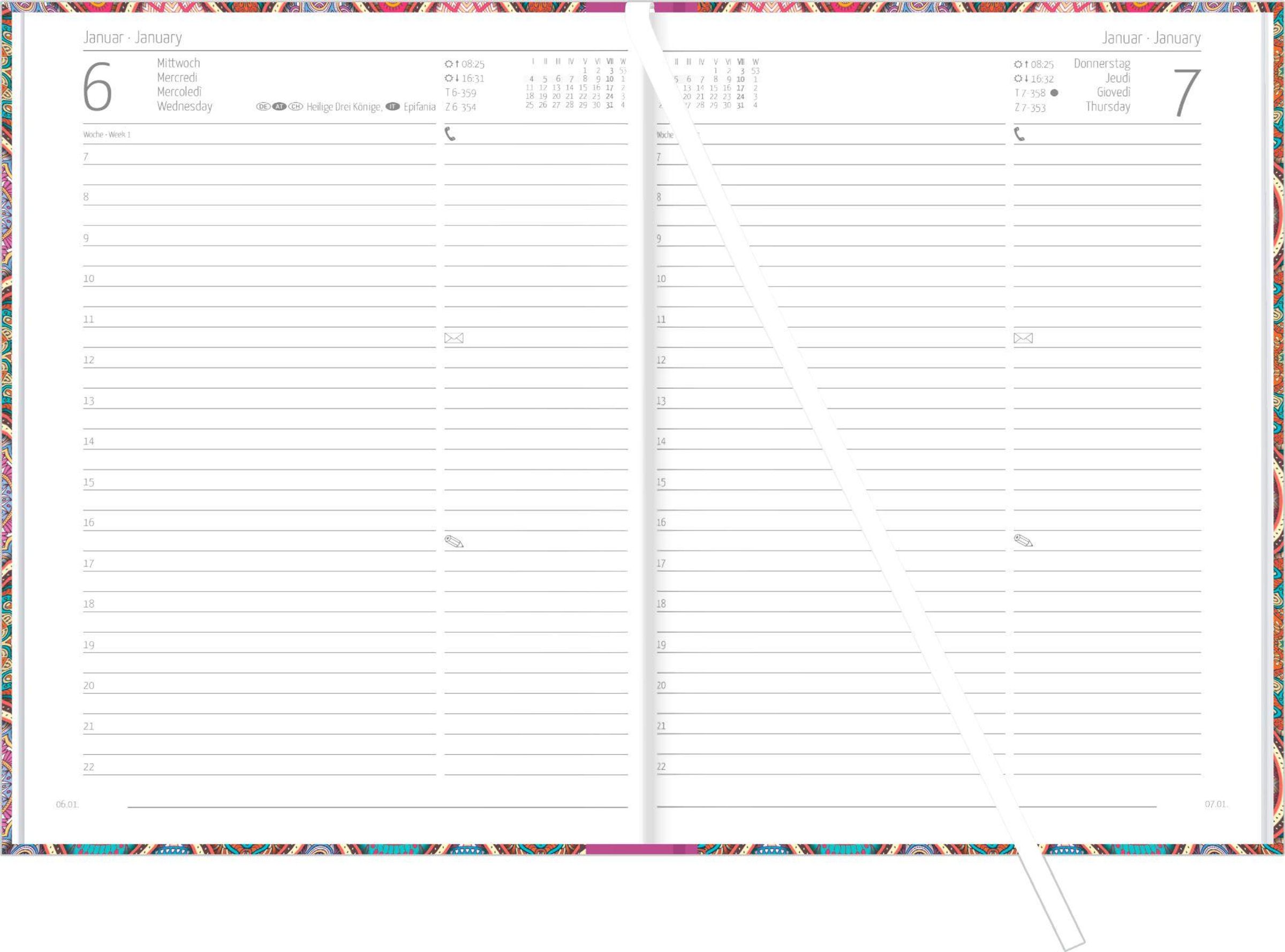 Durchdachte Extras: Leseband, Eckenperforation, Ferientermine, Pollenflugkalender, Postentgelte, Telefonvorwahlen, wichtige Internetadressen, Platz für Kontakte & Notizen