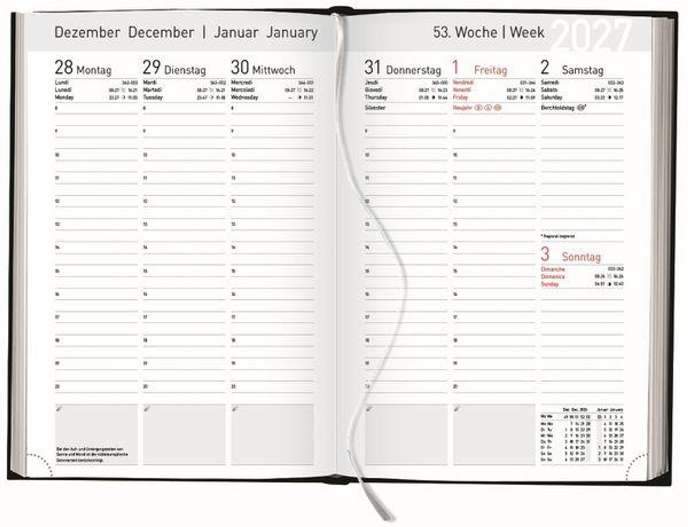 - Lesebändchen sowie praktische Eckperforationen; Anzeige der Mondphasen sowie Aufgangs- und Untergangszeiten von Sonne und Mond