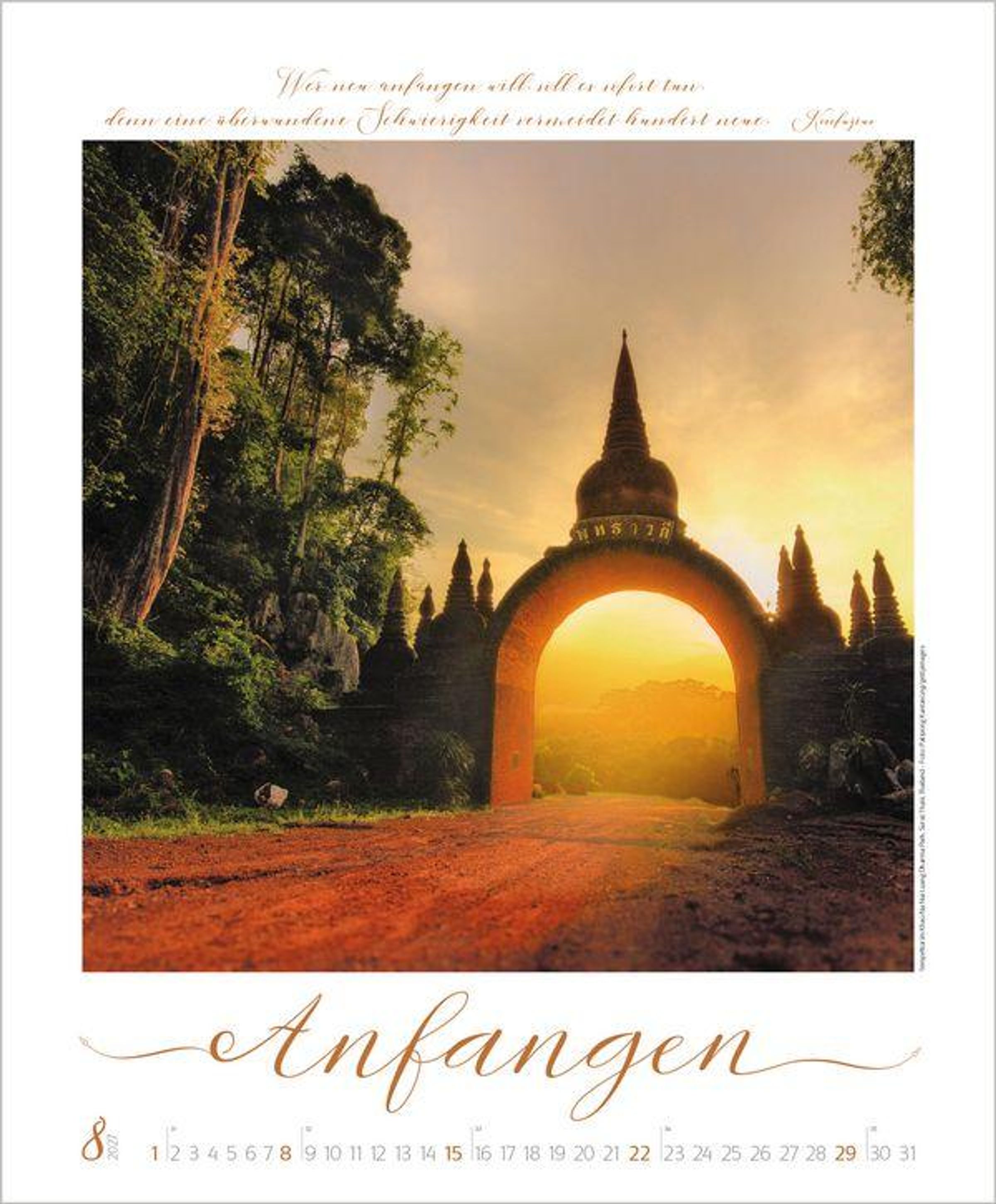 Buddhistische Weisheiten, kombiniert mit wunderschönen meditativen und exotischen Aufnahmen, begleiten im großen Posterformat durch das Jahr und sind Augenschmaus und Inspiration zugleich. Die edle Gestaltung mit Schmuckschrift in Silber-, Gold- und Kupfertönen macht jedes Monatsblatt zu einem eigenen Kunstwerk.
