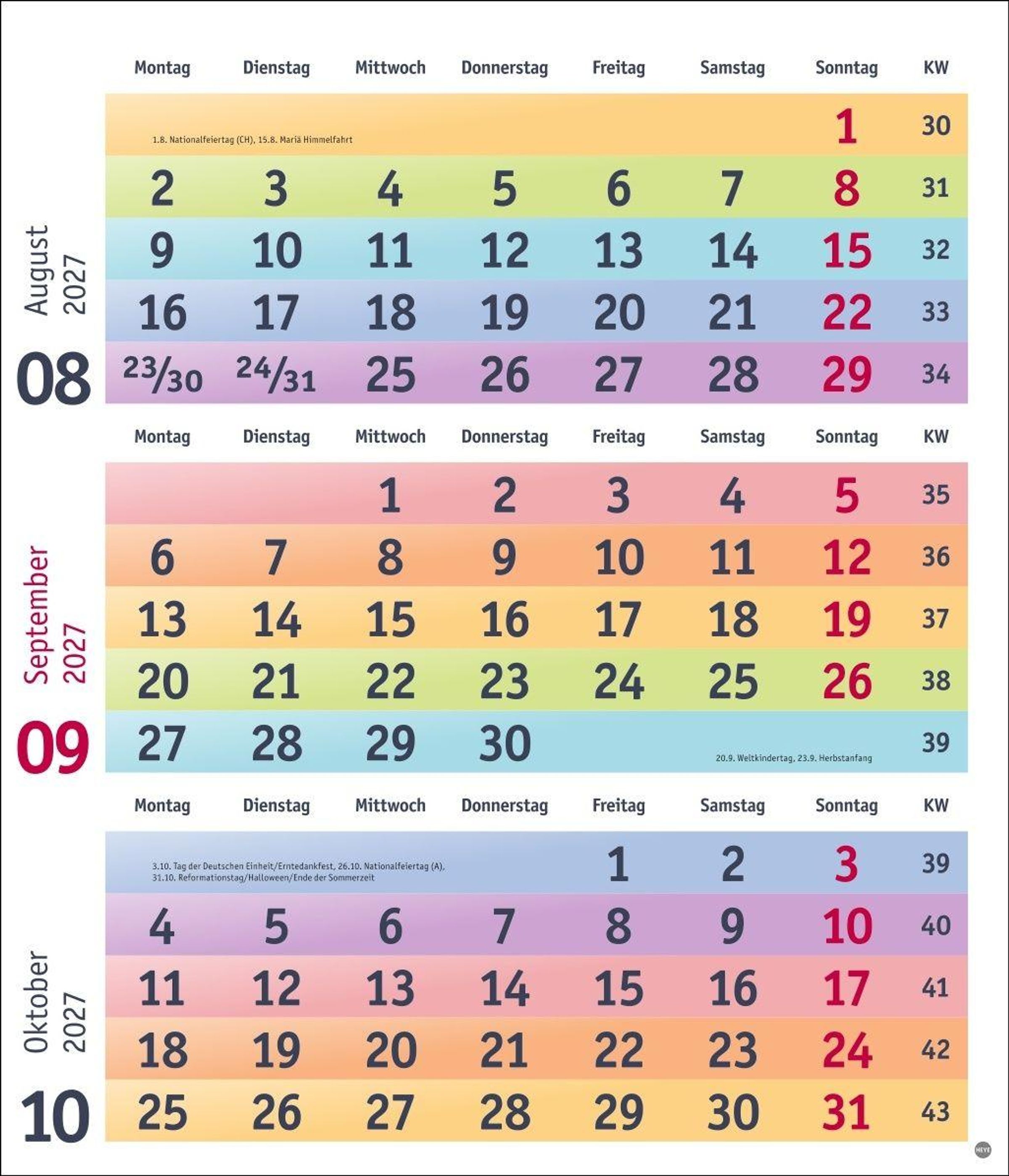 - Farbenfroh und übersichtlich: Wandkalender 2027 mit 3-Monats-Ansicht, Datumsschieber und Schulferien. Neutraler Planer für den schnellen Überblick