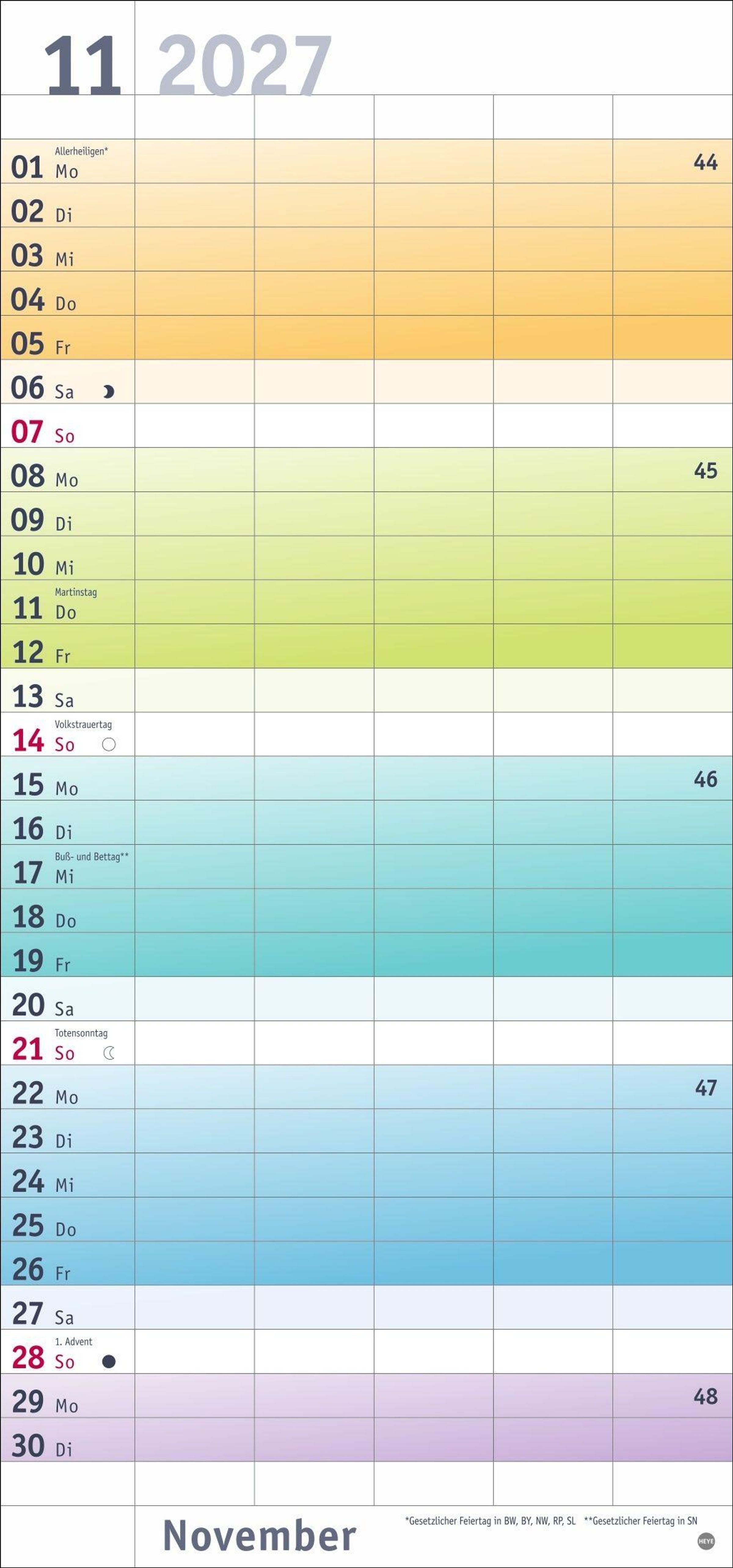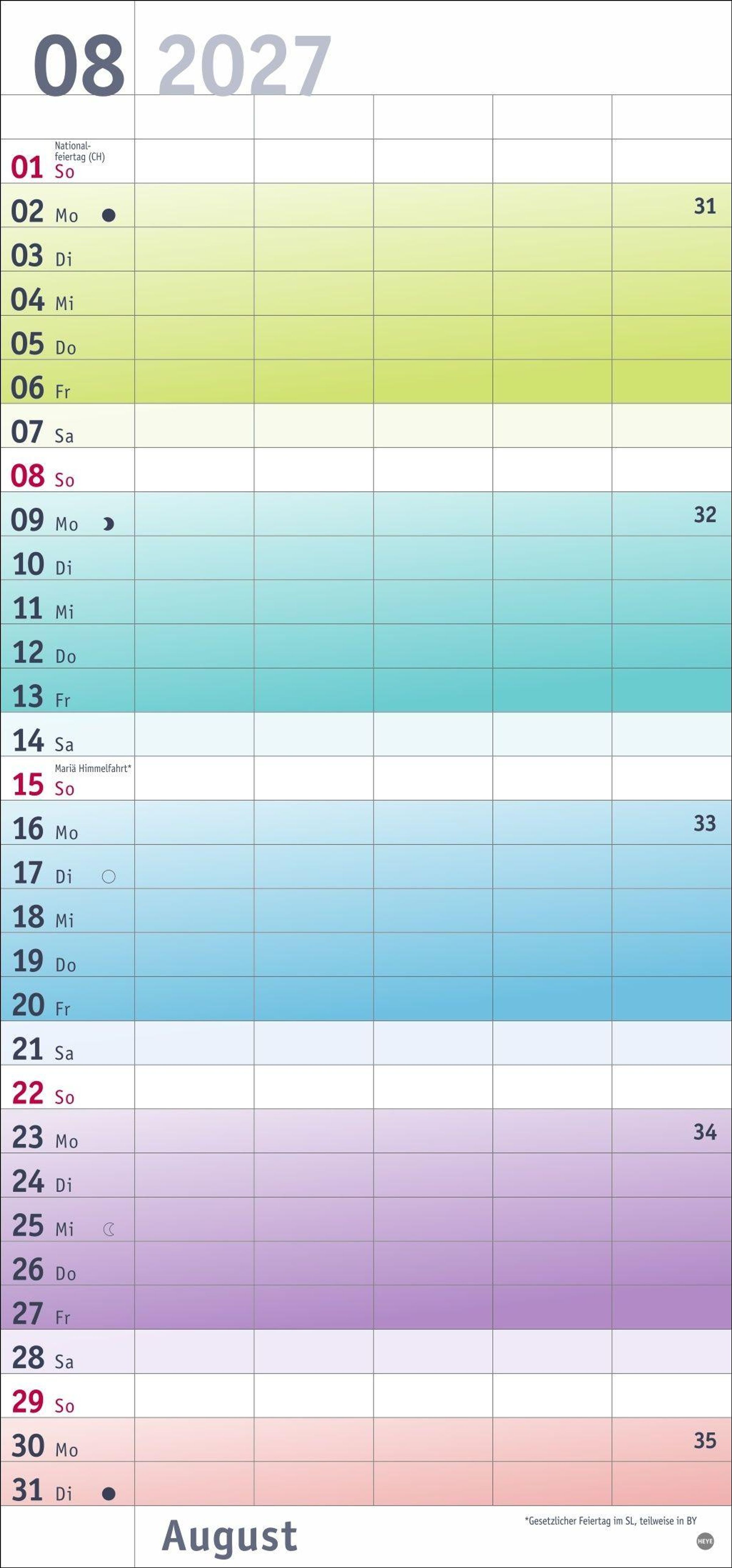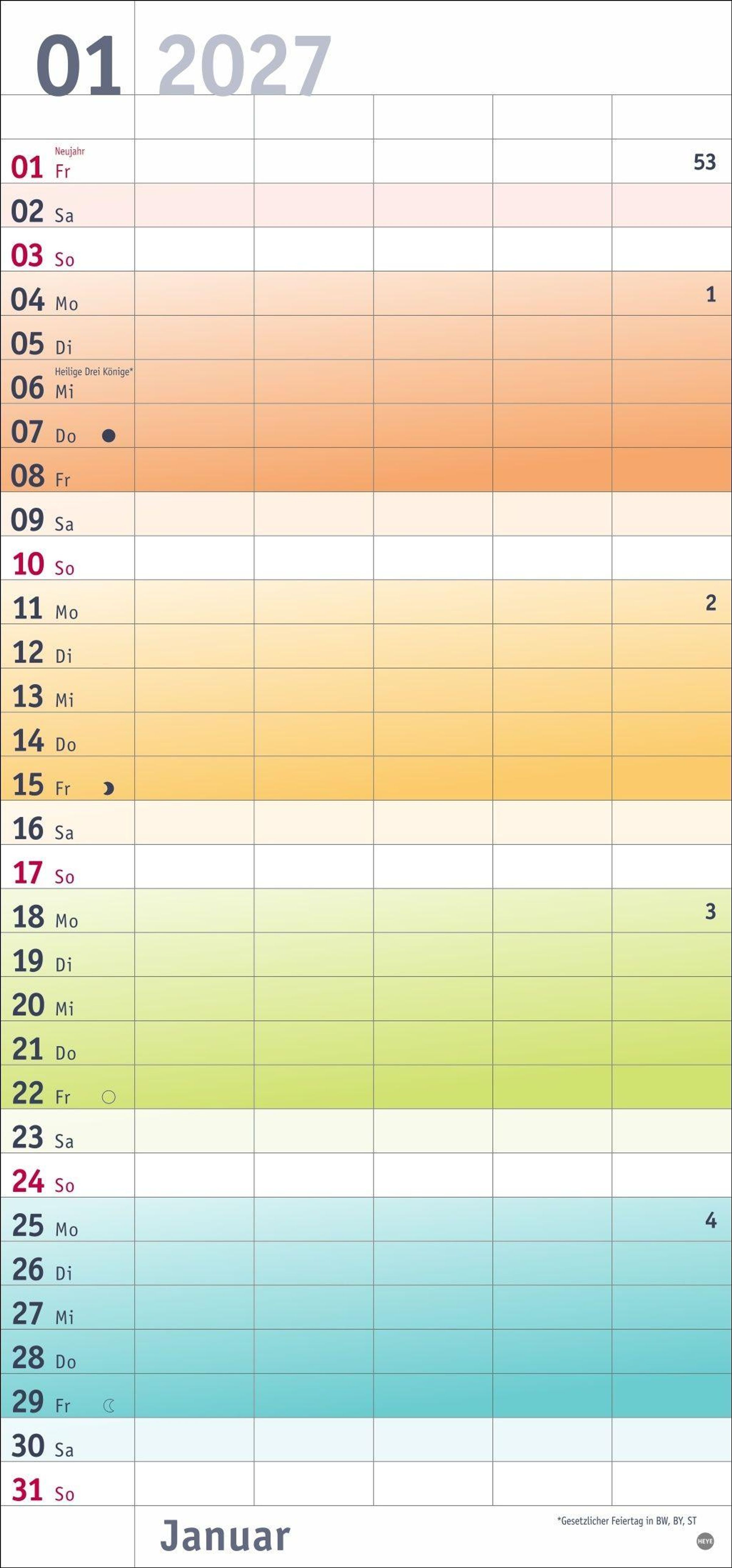 • Praktischer Wandplaner mit 5 Spalten. Familien Wandkalender mit Schulferien und 3-Monats-Ausblick aufs Folgejahr. Terminkalender 2027.