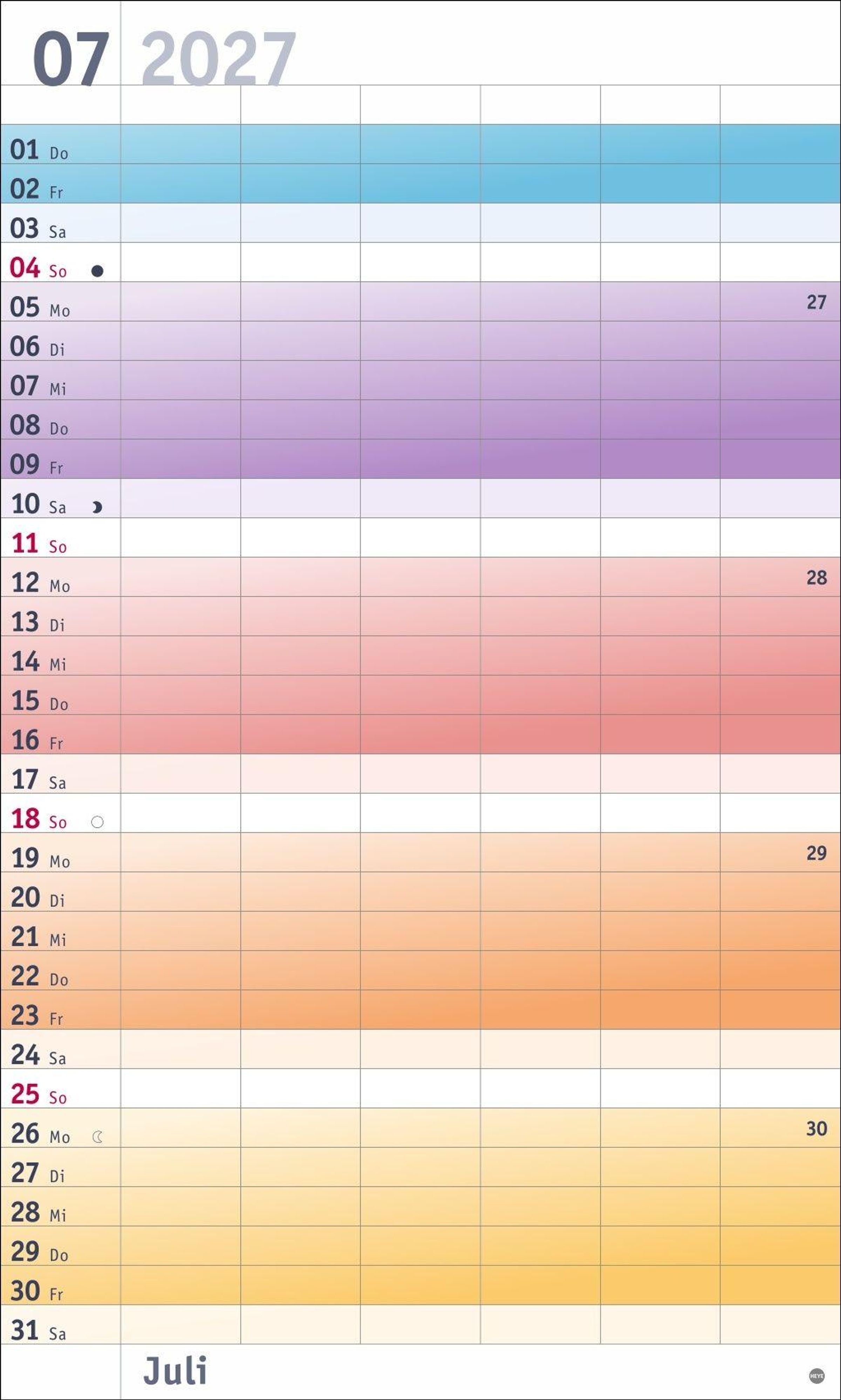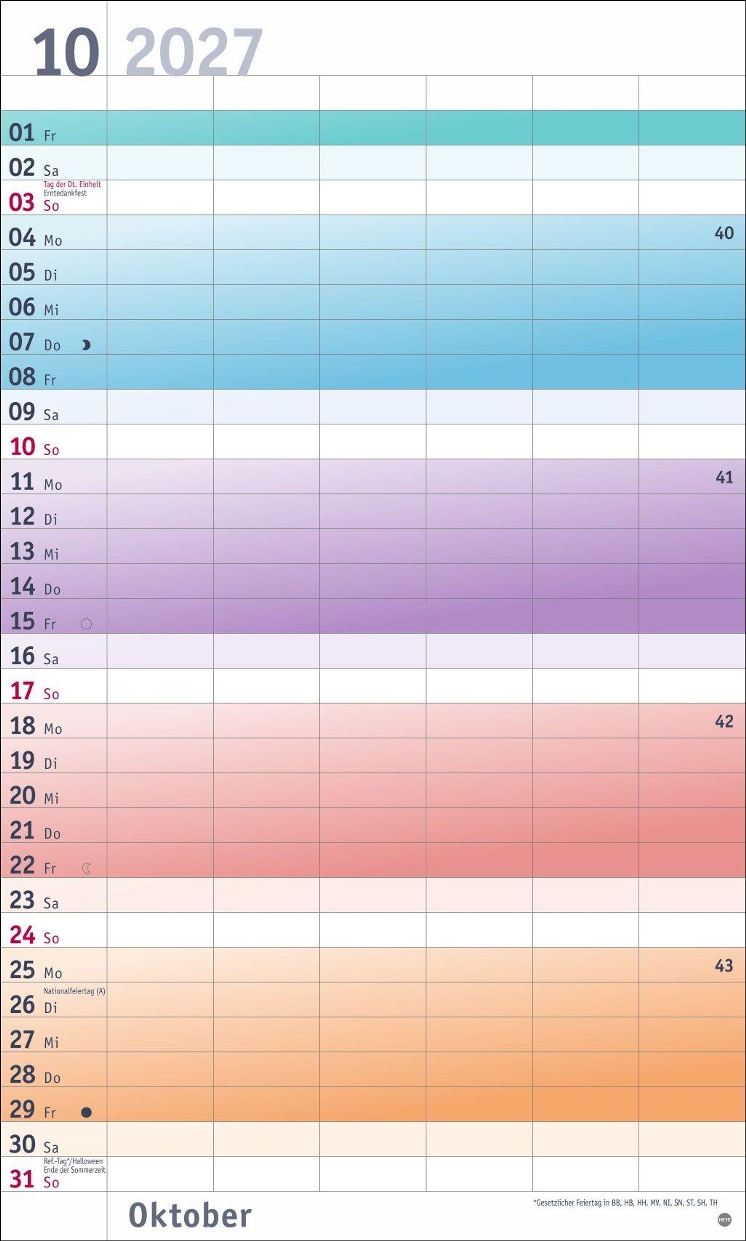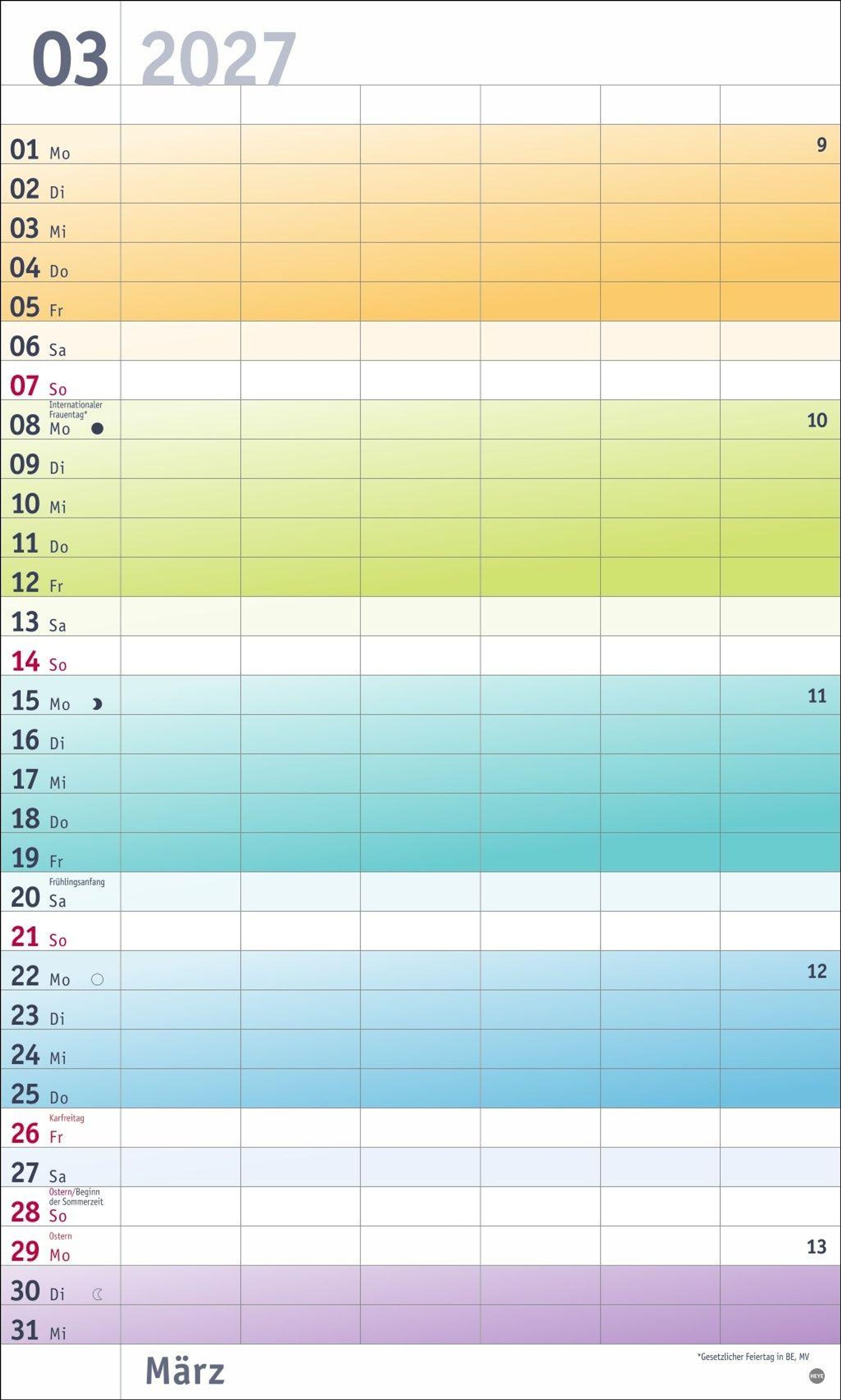 Farbenfrohes Design, neutrale Gestaltung: Kalender ohne platzraubende Muster im Format 27 x 45 cm, der Freiraum für das Wesentliche schafft
