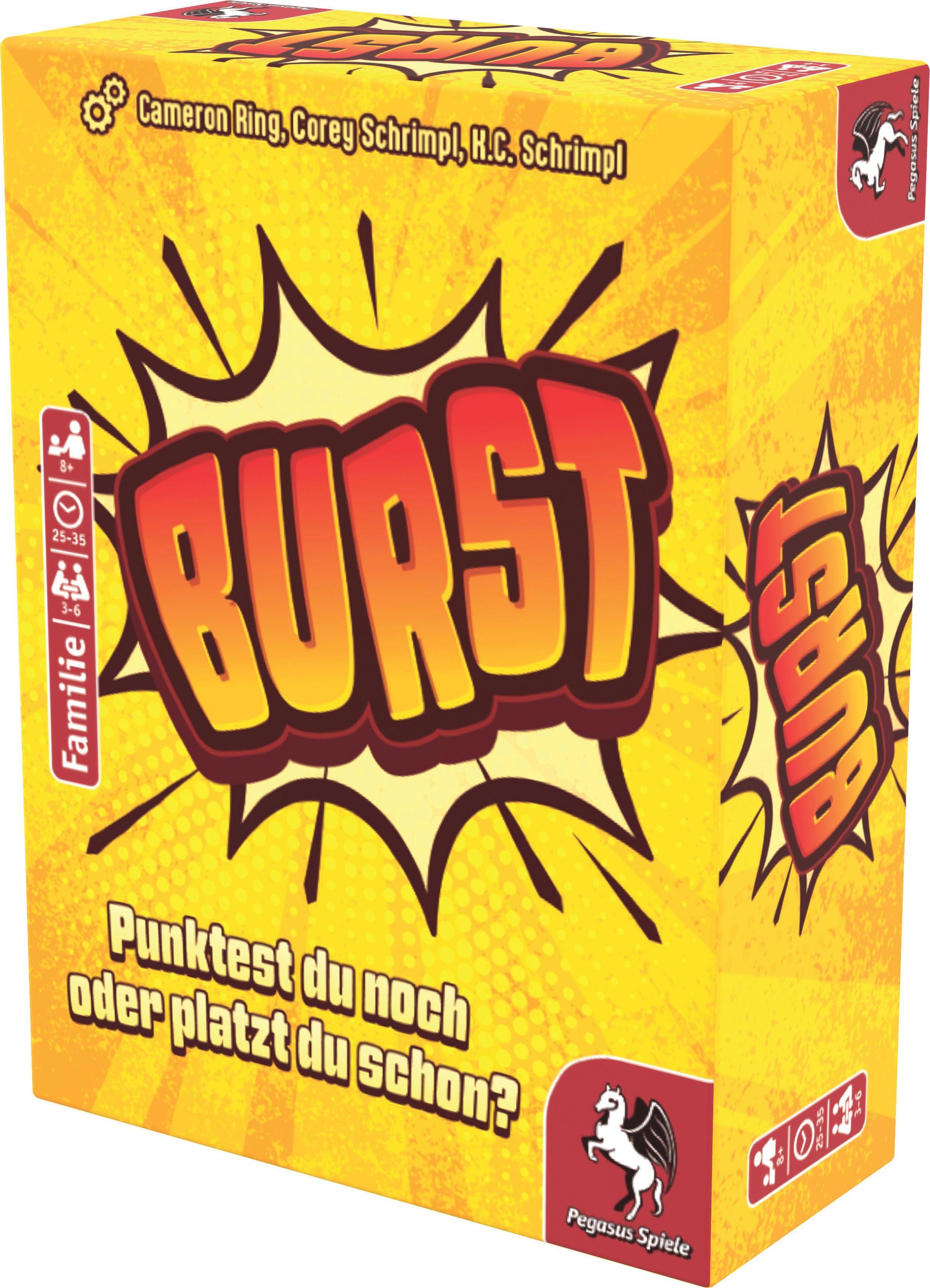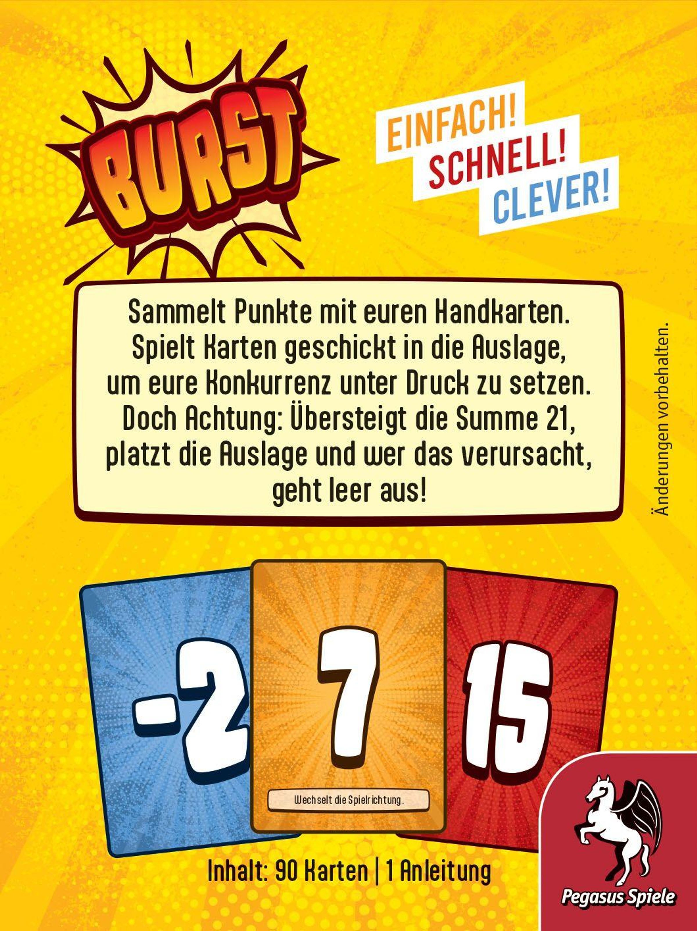 In Burst wetteifern die Spielenden darum, nicht die Person zu sein, die die Kartenauslage zum Bersten bringt. In jeder Runde müssen sie eine Karte nachziehen oder eine Karte aus ihrer Hand ausspielen. Steigt die Summe der Zahlen auf den ausliegenden Karten dabei auf über 21, endet die Runde sofort und alle erhalten Punkte, außer der Person, die die Explosion verursacht hat. Wer so zuerst 100 Punkte erreicht, gewinnt. Minuszahlen und Aktionen wie "Nimm 1 andere Karte aus der Auslage auf die Hand" sorgen für zusätzlichen Wirbel und unvorhersehbare Spielmomente. Burst ist Teil der Spielreihe Einfach! Schnell! Clever!