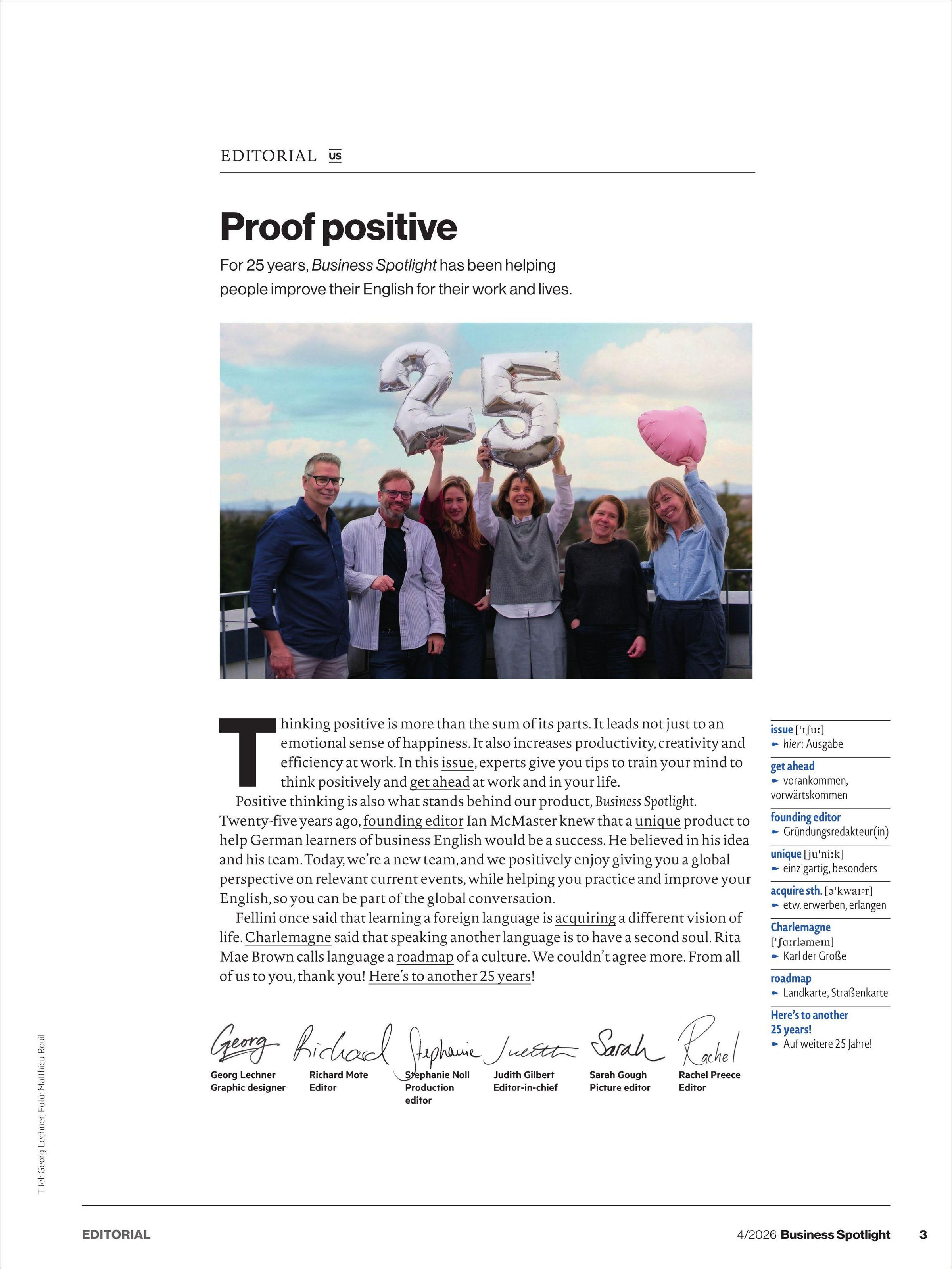 Business Spotlight verbessert nicht nur Ihr sprachliches Niveau in der internationalen Geschäftswelt, sondern gibt Ihnen darüber hinaus auch Tipps und Tricks für interkulturelles Arbeiten sowie aktuelle Berichte zu interessanten Ereignissen der Business-Welt.