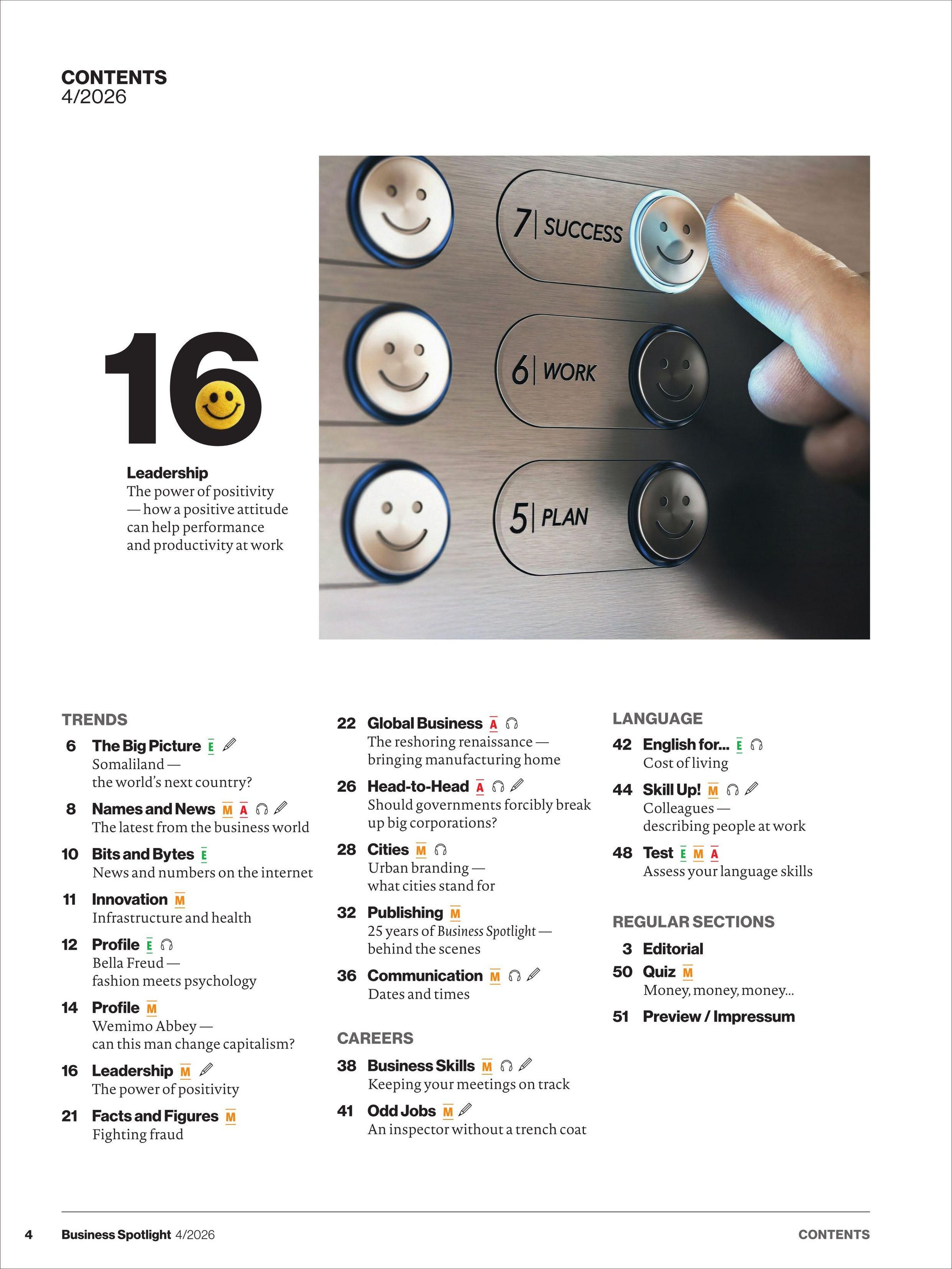 * Titelthema: The power of positivity. How to achieve your goals with positive thinking. * Profile: Bella Freud - fashion meets psychology * Head-to-Head: Should governments forcibly break up big corporations? * Cities: Urban branding - what cities stand for