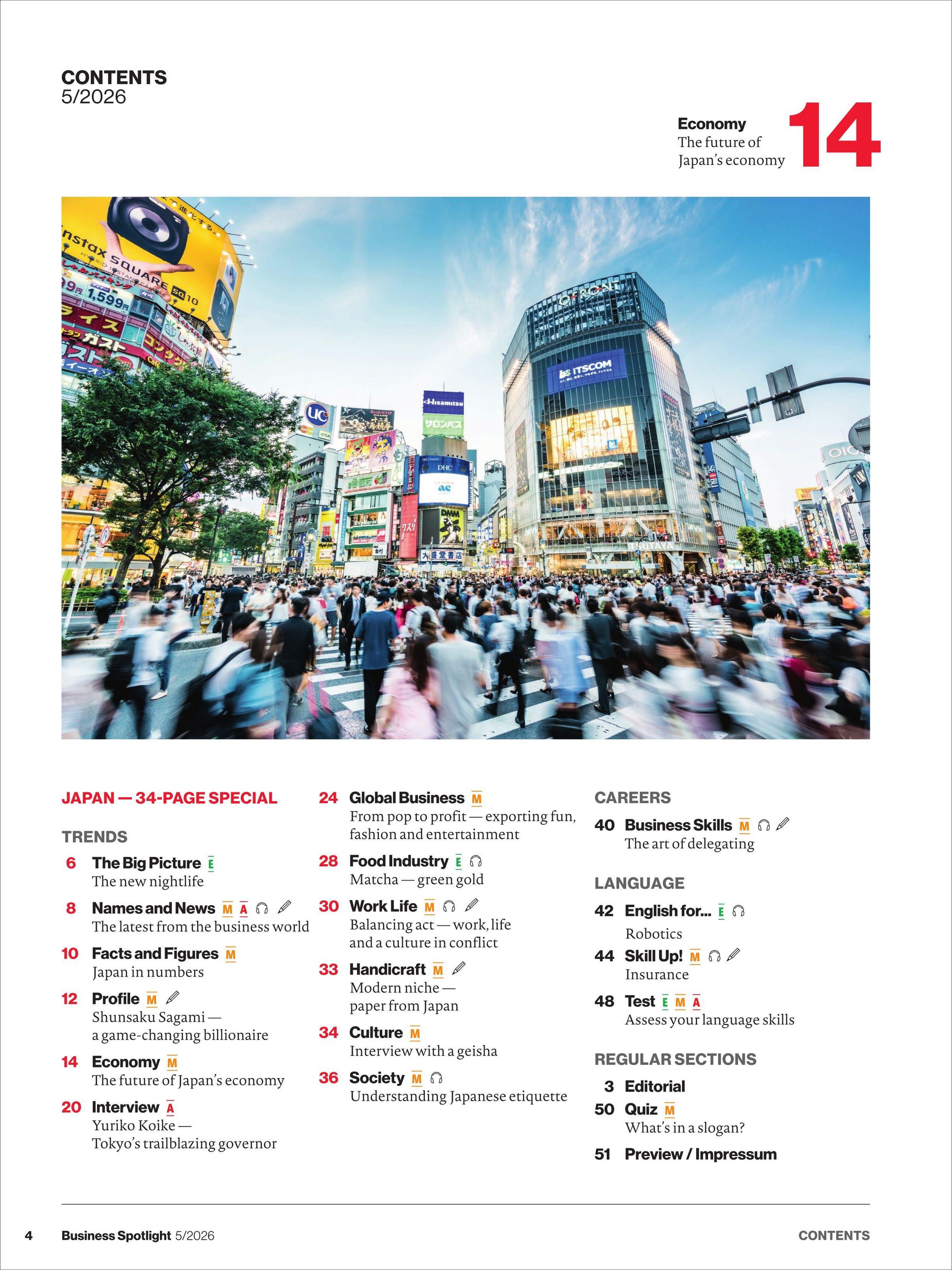 Zeitschriftencover mit dem Titel "Business Spotlight", Themen: Japans Wirtschaft, Tokio, Matcha, Geisha-Interview. Illustration: Skyline, Berg., Buch