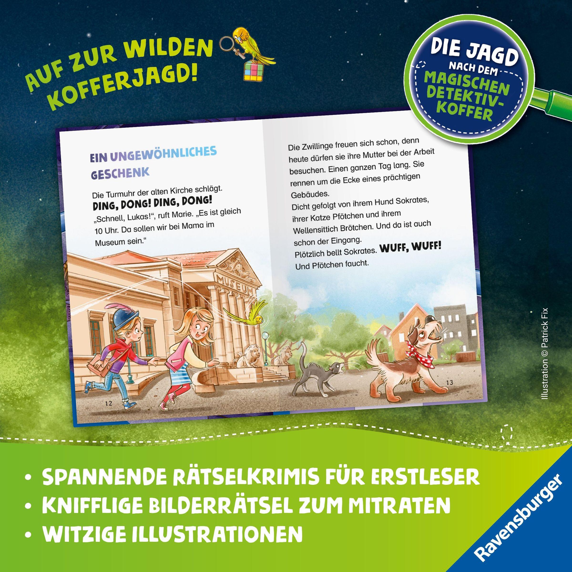 Ein magischer Koffer steht im Mittelpunkt der Erstlesereihe von Cally Stronk. Die Zwillinge Marie und Lukas bekommen ihn an ihrem 7. Geburtstag geschenkt. Was hat es mit dem Koffer auf sich? Und warum sollen die Zwillinge vor Groß und Klein auf der Hut sein? Bald stellt sich heraus, dass die Gegenstände im Koffer magische Fähigkeiten haben! Doch auch ein tollpatschiges Ganovenpärchen ist hinter dem Koffer her... Damit beginnt eine abenteuerliche Jagd nach dem Koffer und die Zwillinge stolpern schon bald von einem Kriminalfall in den nächsten. Und das Beste: Die Leser können den Zwillingen beim Lösen der Fälle behilflich sein, indem sie die im Buch enthaltenen Bilderrätsel lösen. Ein großer Lesespaß für alle Krimifans! Ideal für Erstleser ab 7 Jahren.