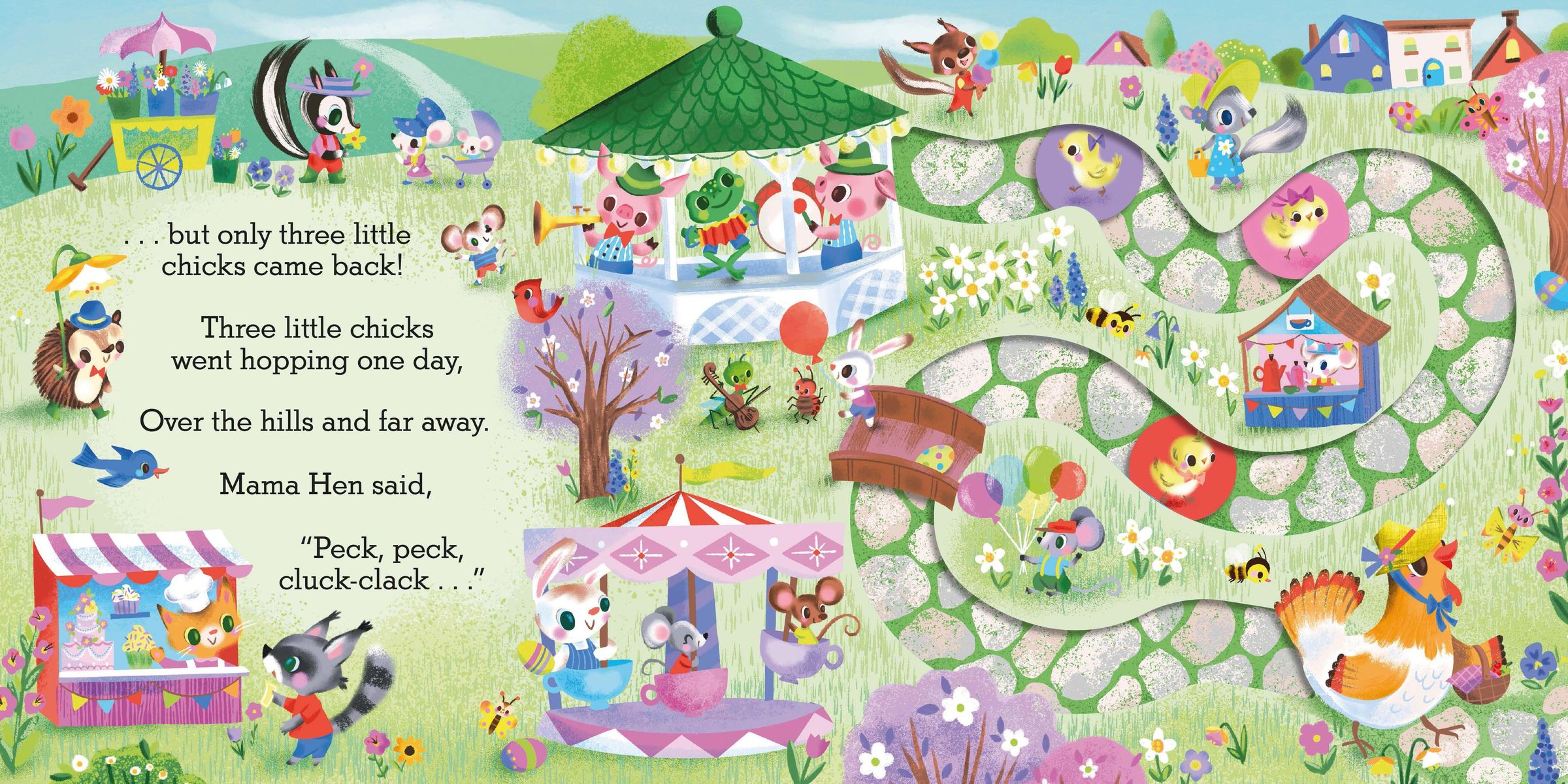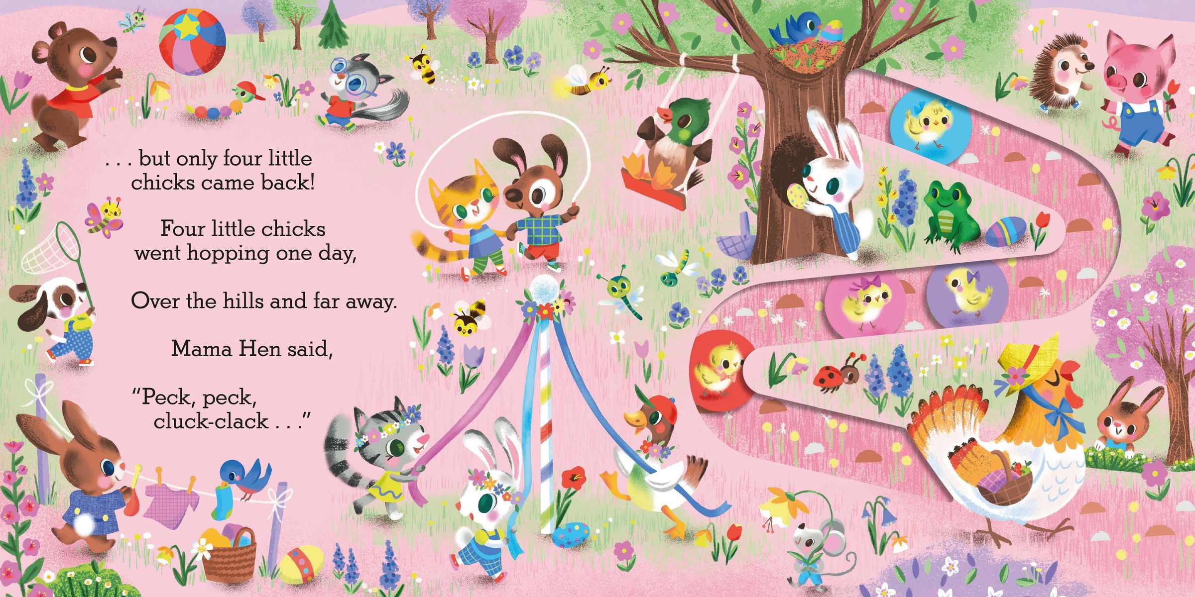 Slide the buttons along the page to count the little chicks in this fun twist on the popular nursery rhyme, Five Little Ducks.