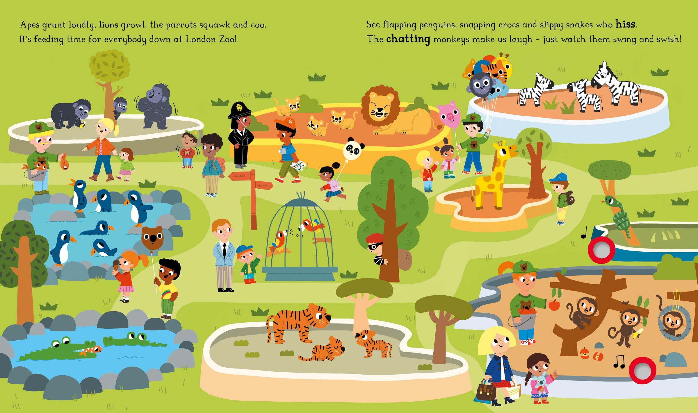 Watch out for beeping double-decker buses, find out who's roaring at the Natural History Museum, listen to the monkeys chitter chatter at London Zoo . . . then finish off the day with a trip to Buckingham Palace. And look out for the naughty crown jewel thief on every page!