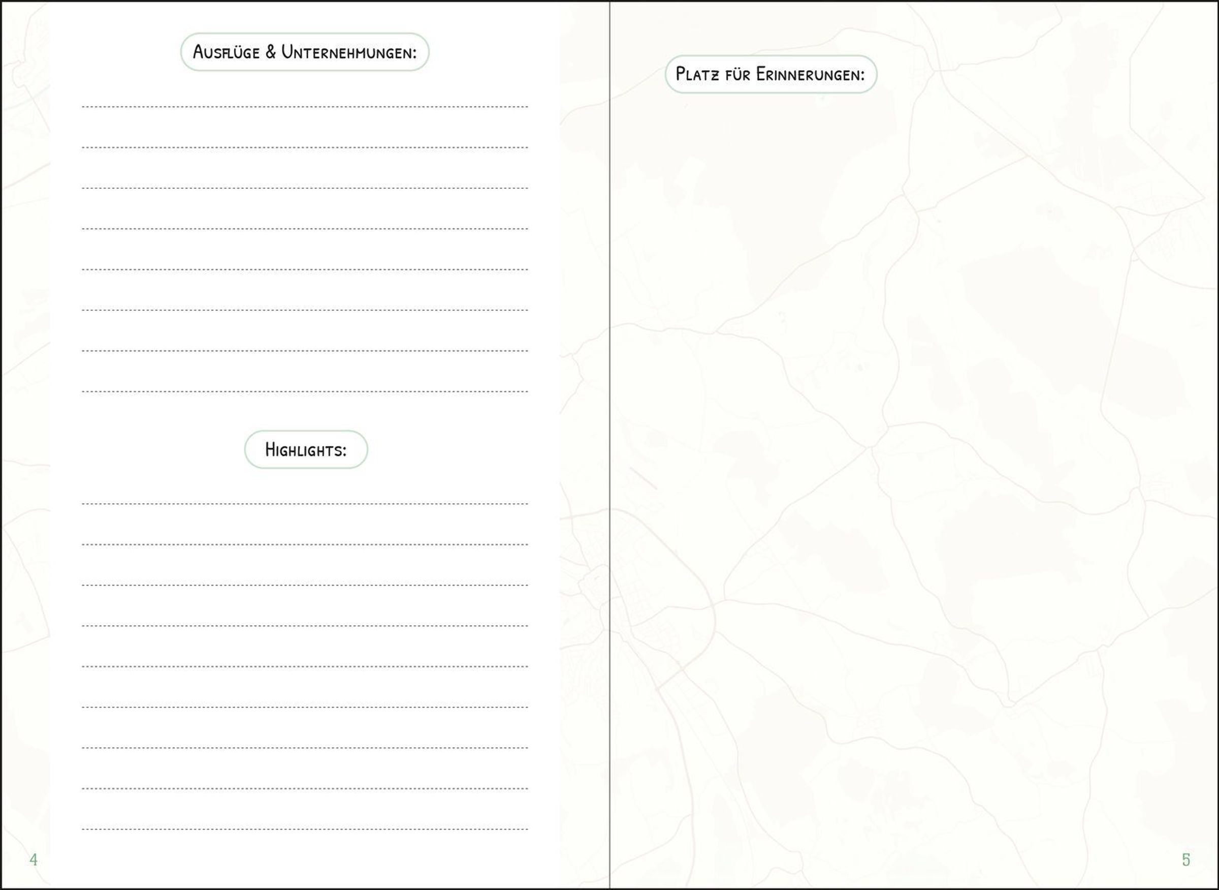 - Platz zum Eintragen der täglichen Erlebnisse + Sonderseiten mit Platz für Reisevorbereitungen, Geheimtipps und Adressen