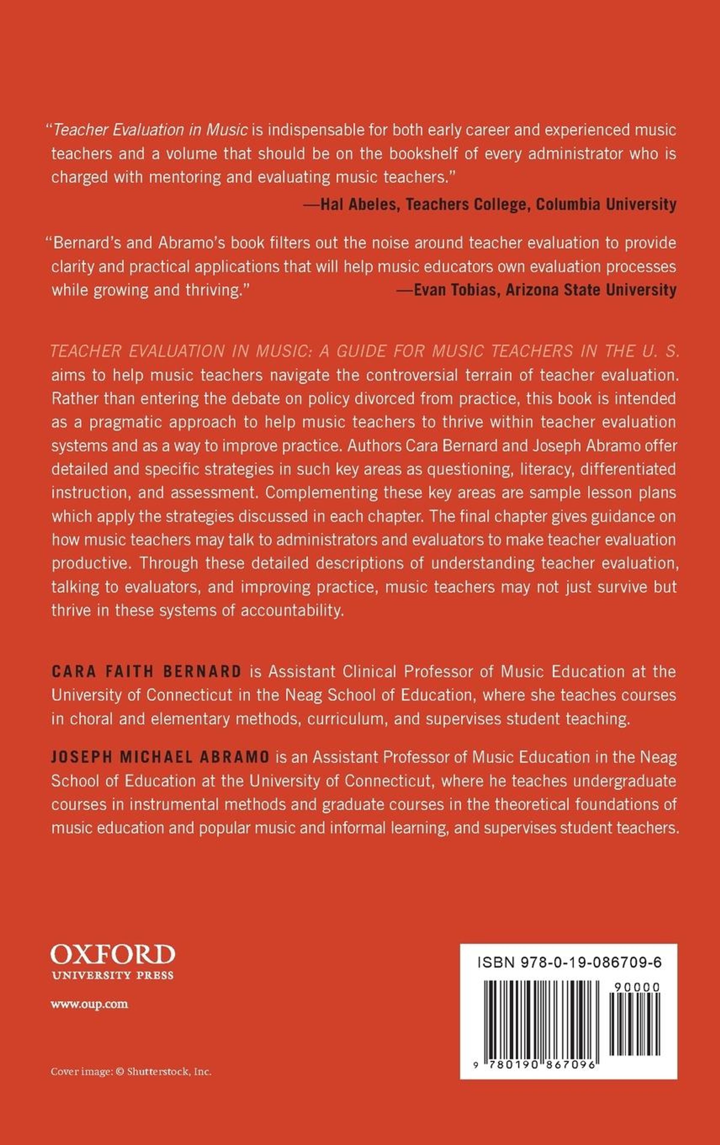 Teacher Evaluation in Music: A Guide for Music Teachers in the U. S. aims to help music teachers navigate the controversial terrain of teacher evaluation. Rather than entering the debate on policy divorced from practice, this book is intended as a pragmatic approach to help music teachers to thrive within teacher evaluation systems and as a way to improve practice. Using Shulman's concept of content knowledge, general pedagogical knowledge, and pedagogical content knowledge, this book strives to help music teachers find a balance between advocating for themselves and their programs and for using teacher evaluation to improve their teaching. The book covers history of policy and law of teacher evaluation and the competing uses of teacher evaluation to rate teachers or as a professional development tool. The descriptions of policies, laws, and competing uses are approached in a way to help music teachers use teacher evaluation for their benefit to grow as professionals. This book has chapters devoted to giving detailed and specific strategies in key areas that research has suggested music teachers struggle to implement: questioning, literacy, differentiated instruction, and assessment. Complimenting these key areas are sample lesson plans which apply the strategies of questioning , differentiation , literacy , and assessment discussed in each chapter. These lessons serve as a resource and guide for teachers to develop their own lessons and improve their practice. The final chapter gives guidance on how music teachers may talk to administrators and evaluators to make teacher evaluation productive. Through these detailed descriptions of understanding teacher evaluation, talking to evaluators, and improving practice, music teachers may not just survive but thrive in these systems of accountability.