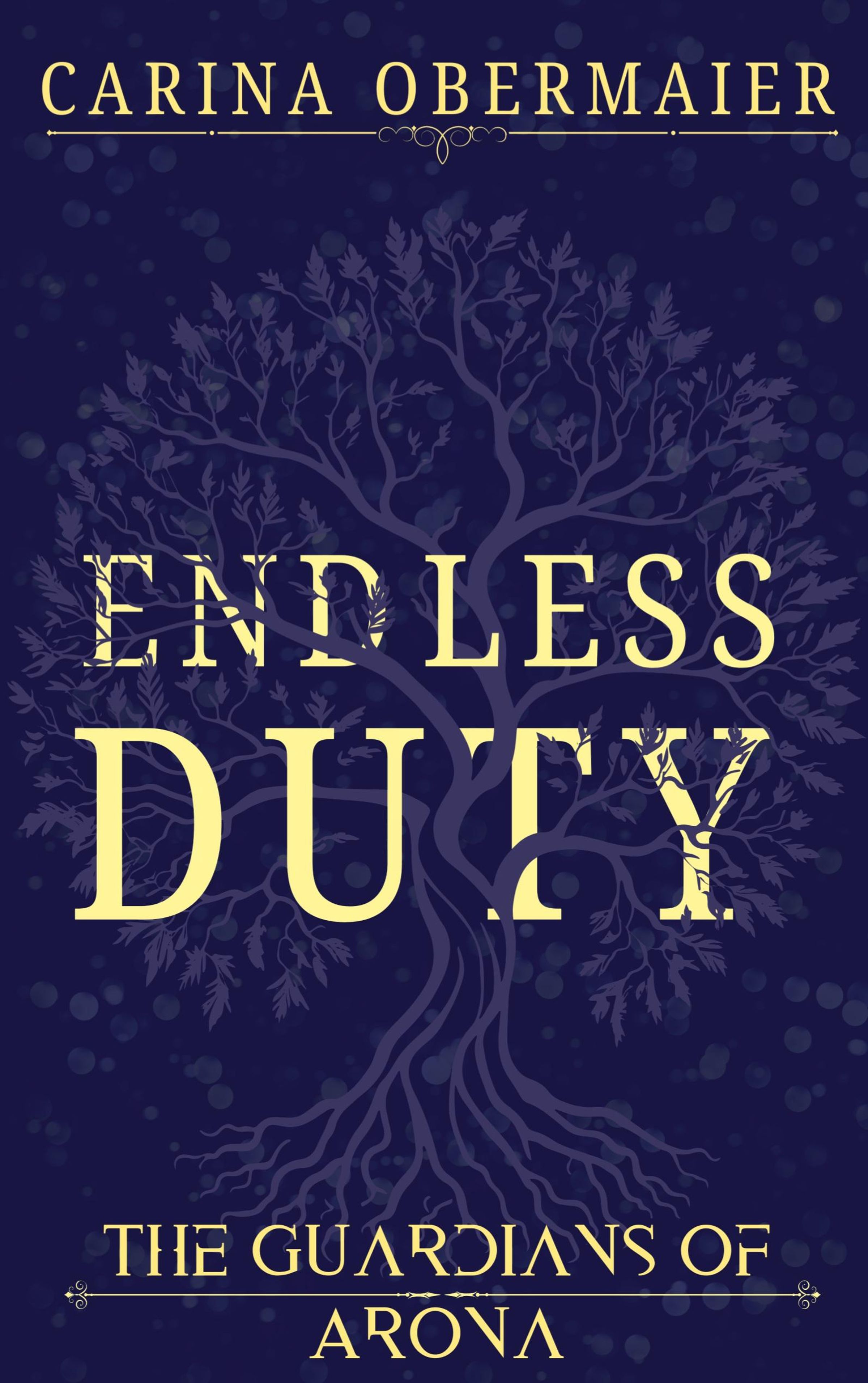 Oben "CARINA OBERMAIER", mittig "ENDLESS DUTY", unten "THE GUARDIANS OF ARONA". Illustration: stilisierter Baum., Buch