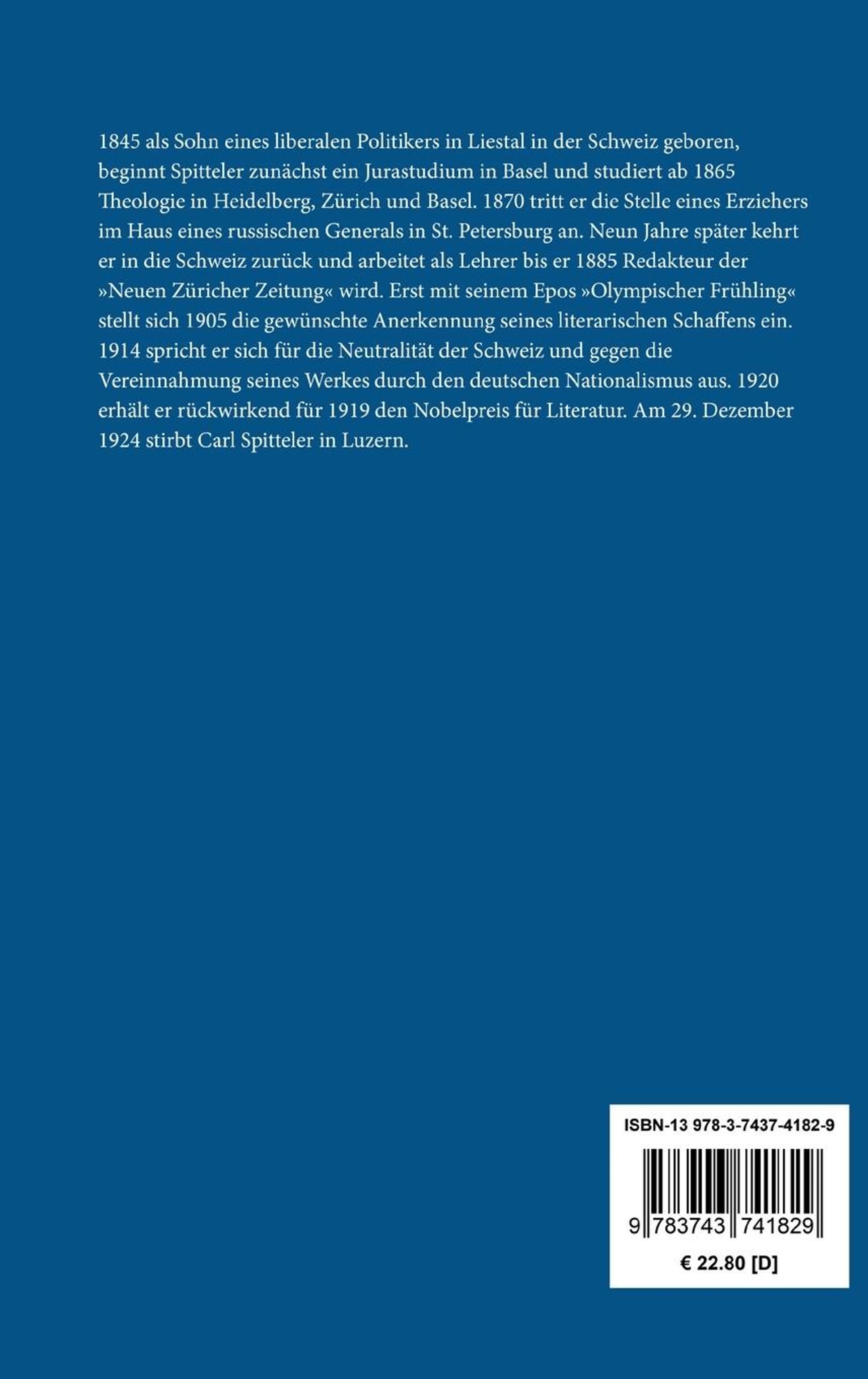 1845 als Sohn eines liberalen Politikers in Liestal in der Schweiz geboren, beginnt Spitteler zunächst ein Jurastudium in Basel und studiert ab 1865 Theologie in Heidelberg, Zürich und Basel. 1870 tritt er die Stelle eines Erziehers im Haus eines russischen Generals in St. Petersburg an. Neun Jahre später kehrt er in die Schweiz zurück und arbeitet als Lehrer bis er 1885 Redakteur der >>Neuen Züricher Zeitung<< wird. Erst mit seinem Epos >>Olympischer Frühling<< stellt sich 1905 die gewünschte Anerkennung seines literarischen Schaffens ein. 1914 spricht er sich für die Neutralität der Schweiz und gegen die Vereinnahmung seines Werkes durch den deutschen Nationalismus aus. 1920 erhält er rückwirkend für 1919 den Nobelpreis für Literatur. Am 29. Dezember 1924 stirbt Carl Spitteler in Luzern.