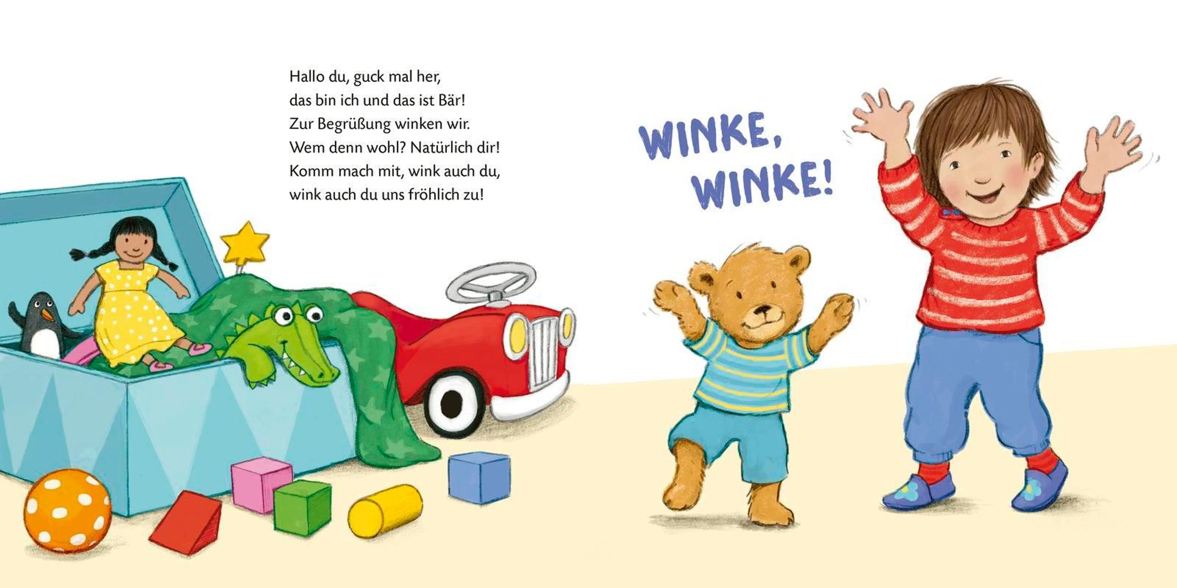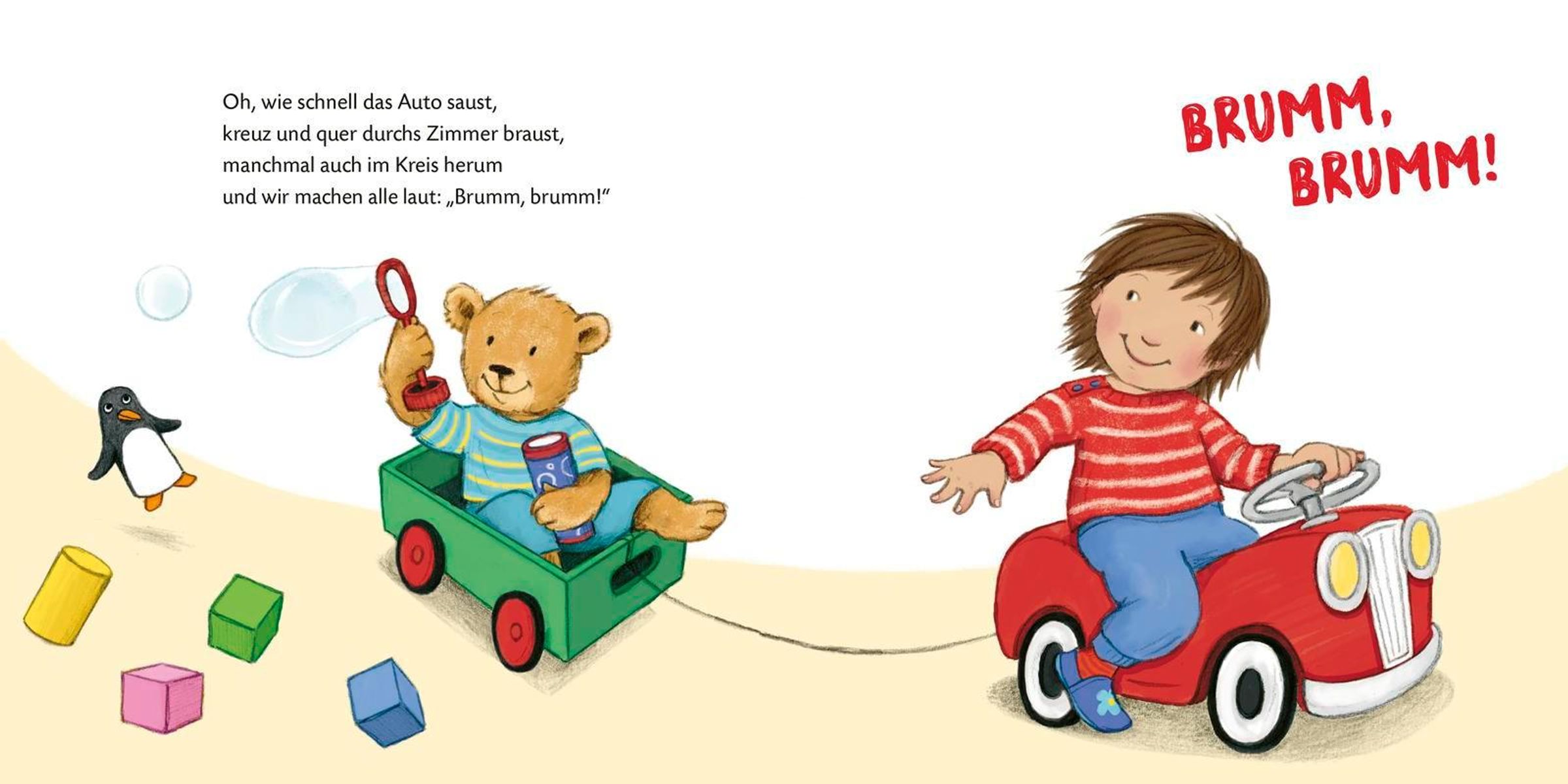 In diesem Buch zum Mitmachen für Kinder ab 18 Monaten werden Seifenblasen über die Seite gepustet, kommt ein Spielzeugauto mit lautem Brummbrumm um die Ecke gedüst und Kind und Bär spielen Verstecken. So kommt Bewegung in jedes Kinderzimmer und Schwung in die Sprachentwicklung. Lustige, animierende Reime, Bewegung und Sinneswahrnehmung sind die ideale Kombination um das Kind ganzheitlich und mit Spaß in der Entwicklung zu unterstützen.
