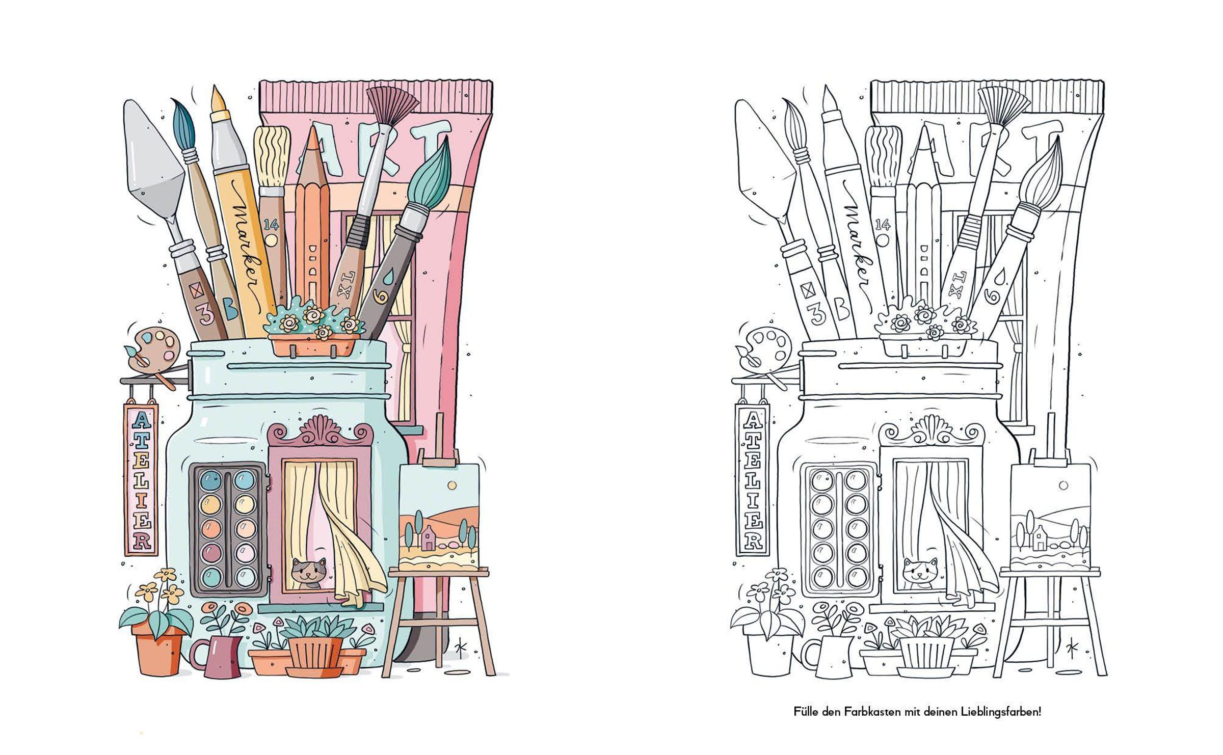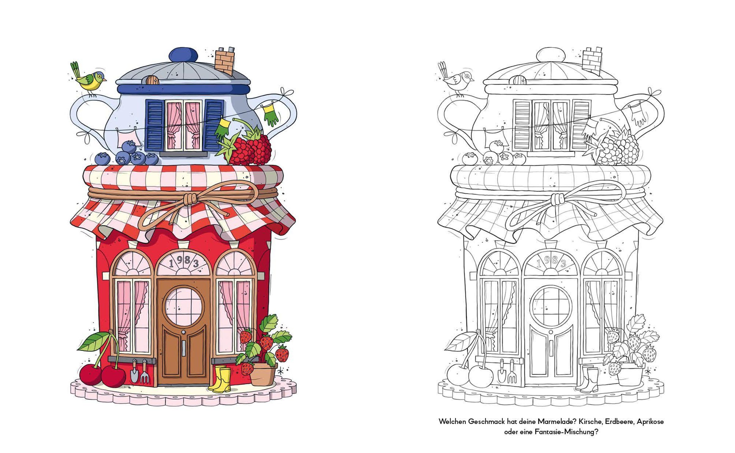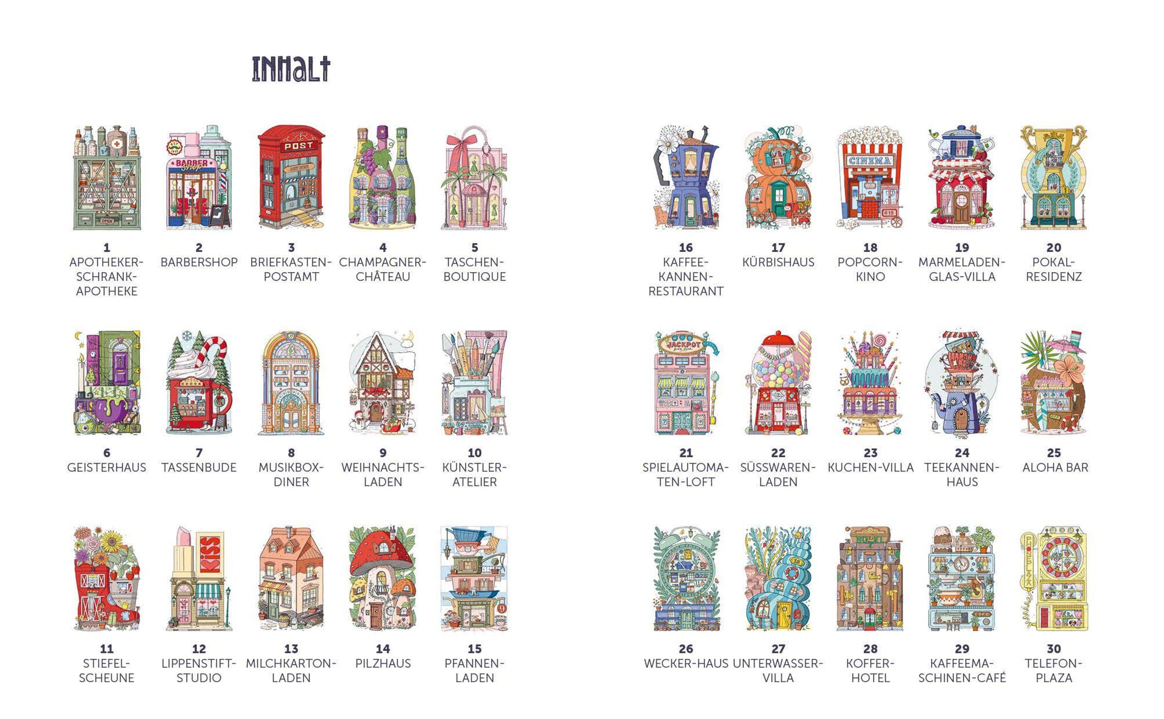- 30 fantasievolle und verspielte Gebäude und Shops kolorieren | Pilzhaus, Pinselglas-Atelier, Koffer-Hotel, Kokosnuss-Bar und mehr
