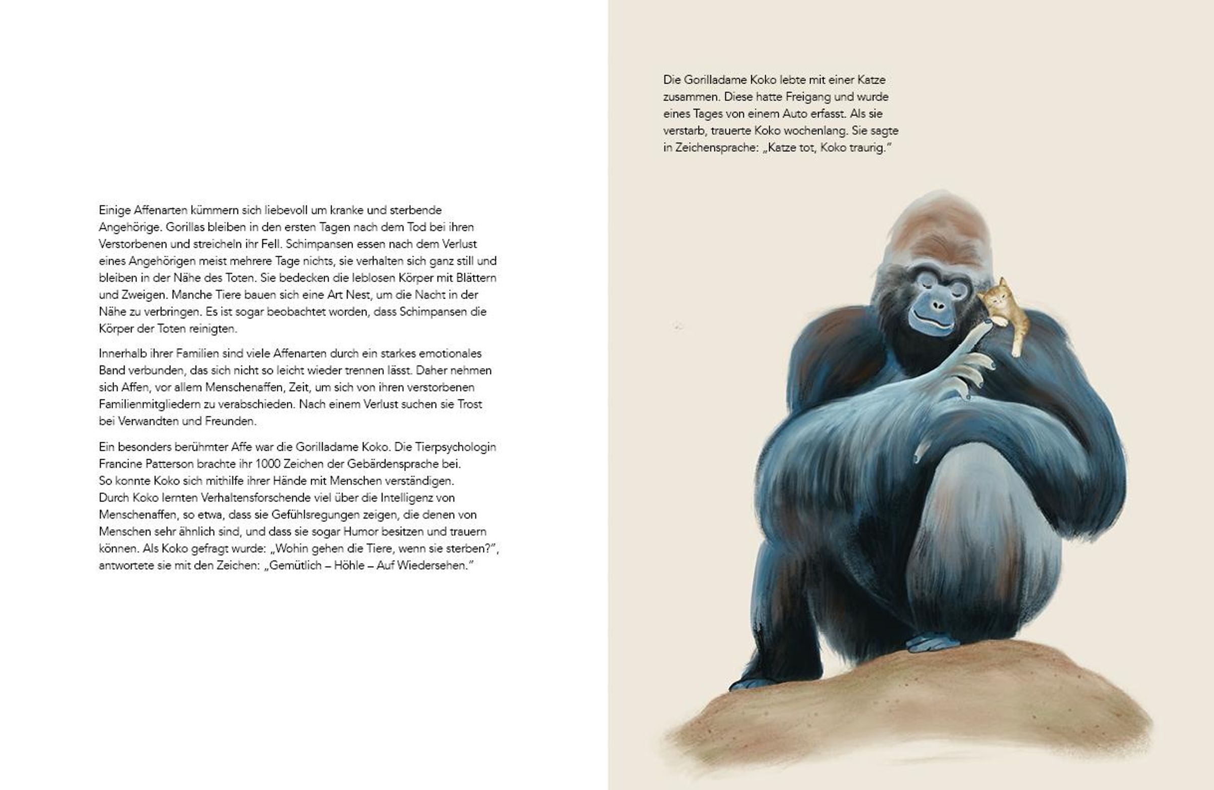 Verabschieden, trauern, erinnern: Elefanten ziehen sich zum Sterben zurück, Angehörige halten Wache. Schimpansen tragen ihre Artgenossen zur letzten Ruhe und besuchen die Orte des Sterbens danach eine Weile nicht. Katzen durchlaufen verschiedene Trauerphasen, die vom Schock über den Verlust in die Akzeptanz der neuen Situation münden. Jede Tierart hat eigene Wege, mit Tod und Trauer umzugehen, dies wird auch in der Wissenschaft mehr und mehr erforscht. Genau wie bei Menschen gilt: Es gibt nicht den einen Weg, um mit Trauer umzugehen, sondern viele Varianten. Dieses Buch zeigt Kindern, dass Trauer und Tod einen Platz im Leben haben und möchte dabei helfen, diese schwierigen Themen zu begreifen und darüber zu sprechen. Ausgezeichnet mit dem EMYS - Sachbuchpreis für Kinder- und Jugendliteratur.