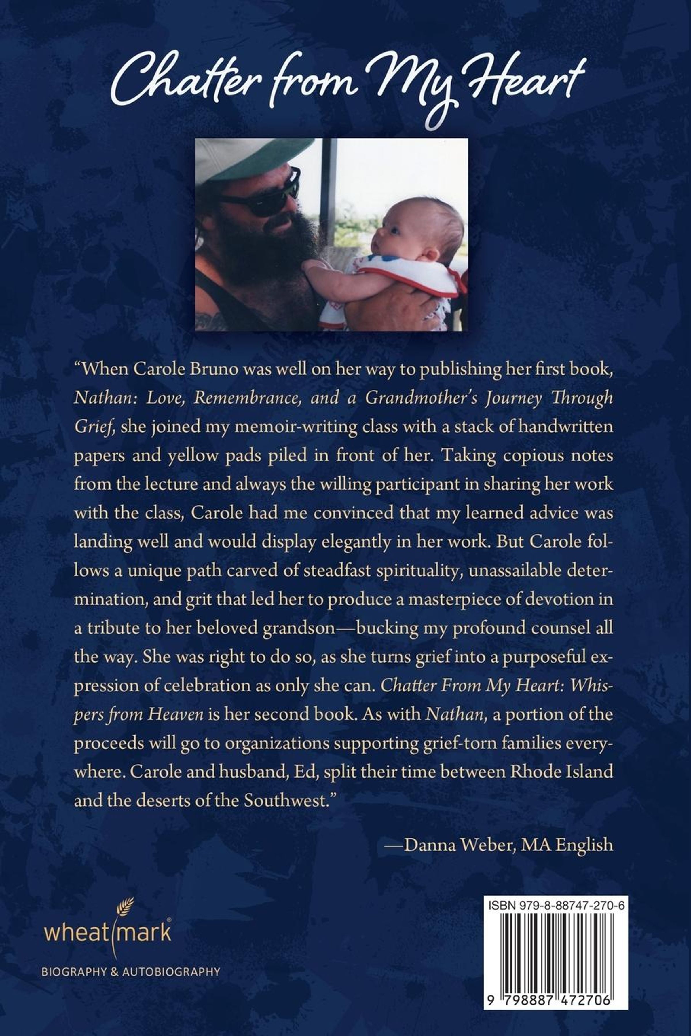 "When Carole Bruno was well on her way to publishing her first book, Nathan: Love, Remembrance, and a Grandmother's Journey Through Grief, she joined my memoir-writing class with a stack of handwritten papers and yellow pads piled in front of her. Taking copious notes from the lecture and always the willing participant in sharing her work with the class, Carole had me convinced that my learned advice was landing well and would display elegantly in her work. But Carole follows a unique path carved of steadfast spirituality, unassailable determination, and grit that led her to produce a masterpiece of devotion in a tribute to her beloved grandson-bucking my profound counsel all the way. She was right to do so, as she turns grief into a purposeful expression of celebration as only she can. Chatter from My Heart: Whispers From Heaven is her second book. As with Nathan, a portion of the proceeds will go to organizations supporting grief-torn families everywhere. Carole and husband, Ed, split their time between Rhode Island and the deserts of the Southwest." -Danna Weber, MA English