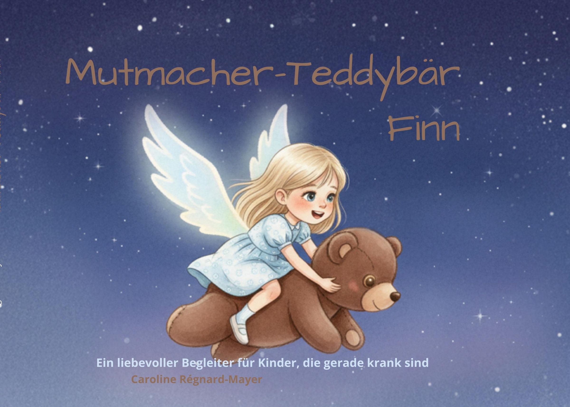„Mutmacher-Teddybär Finn“ steht geschrieben. Ein blondes Kind reitet lächelnd auf einem Teddybären durch einen Sternenhimmel., Buch