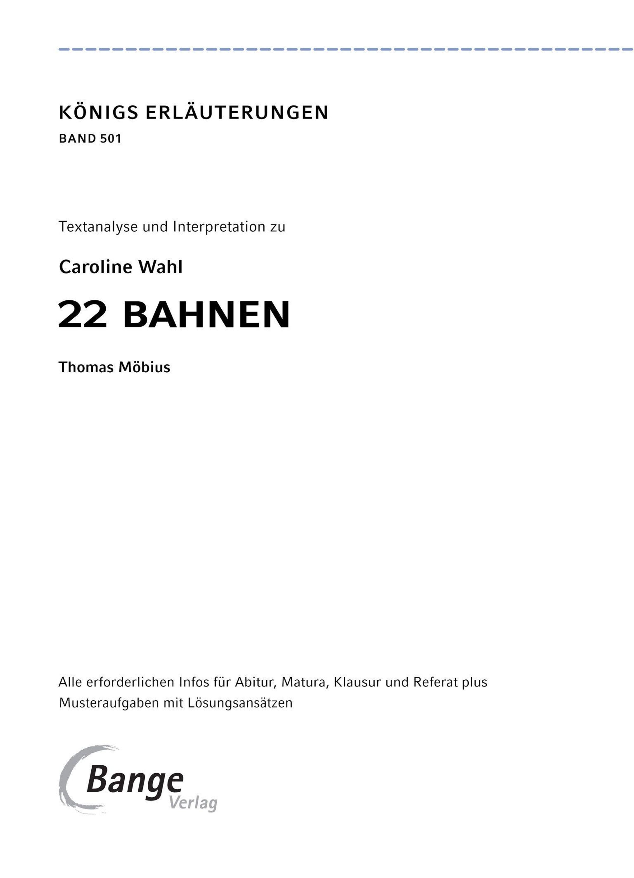 Spare Zeit und verzichte auf lästige Recherche! In diesem Band zu Caroline Wahl, 22 Bahnen findest du alles, was du zur Vorbereitung auf Referat, Klausur, Abitur oder Matura benötigst - ohne das Werk komplett gelesen zu haben.