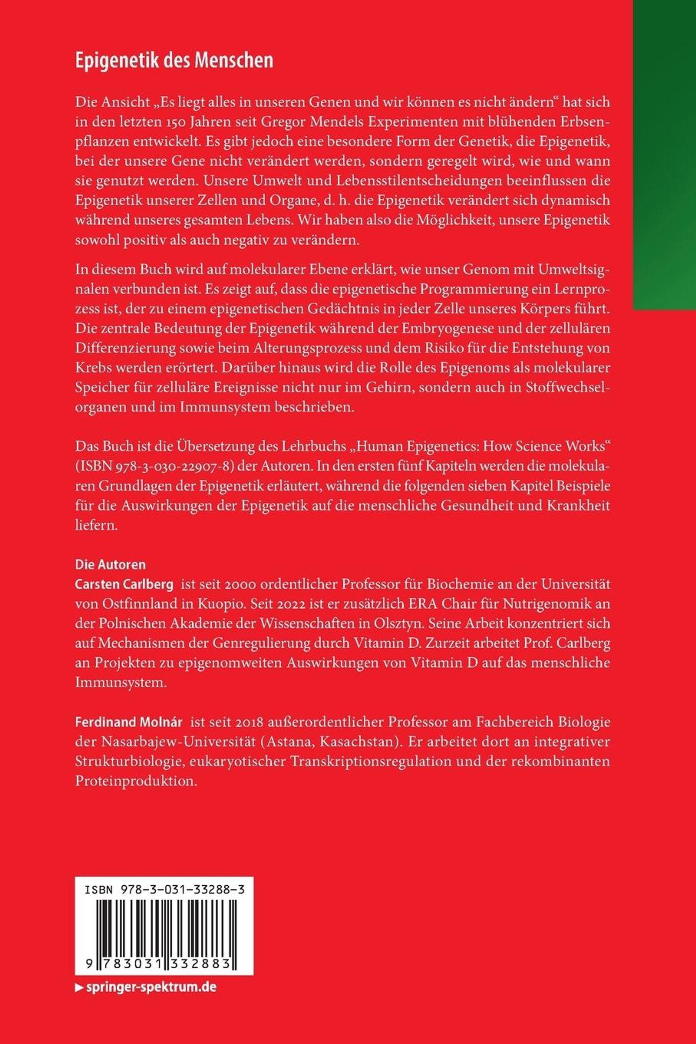 Einführung.- Chromatin und Genexpression.- DNA-Methylierung.- Histonmodifikationen.- Chromatin-modifizierende Proteine und RNAs.- Embryogenese und Zelldifferenzierung.- Bevölkerungsepigenetik und Altern.- Epigenetik und Krebs .- Neuroepigenetik.- Ernährungsepigenetik.- Epigenetik der Immunfunktion.- Epigenom-Umwelt-Interaktionen und ihre Therapie.