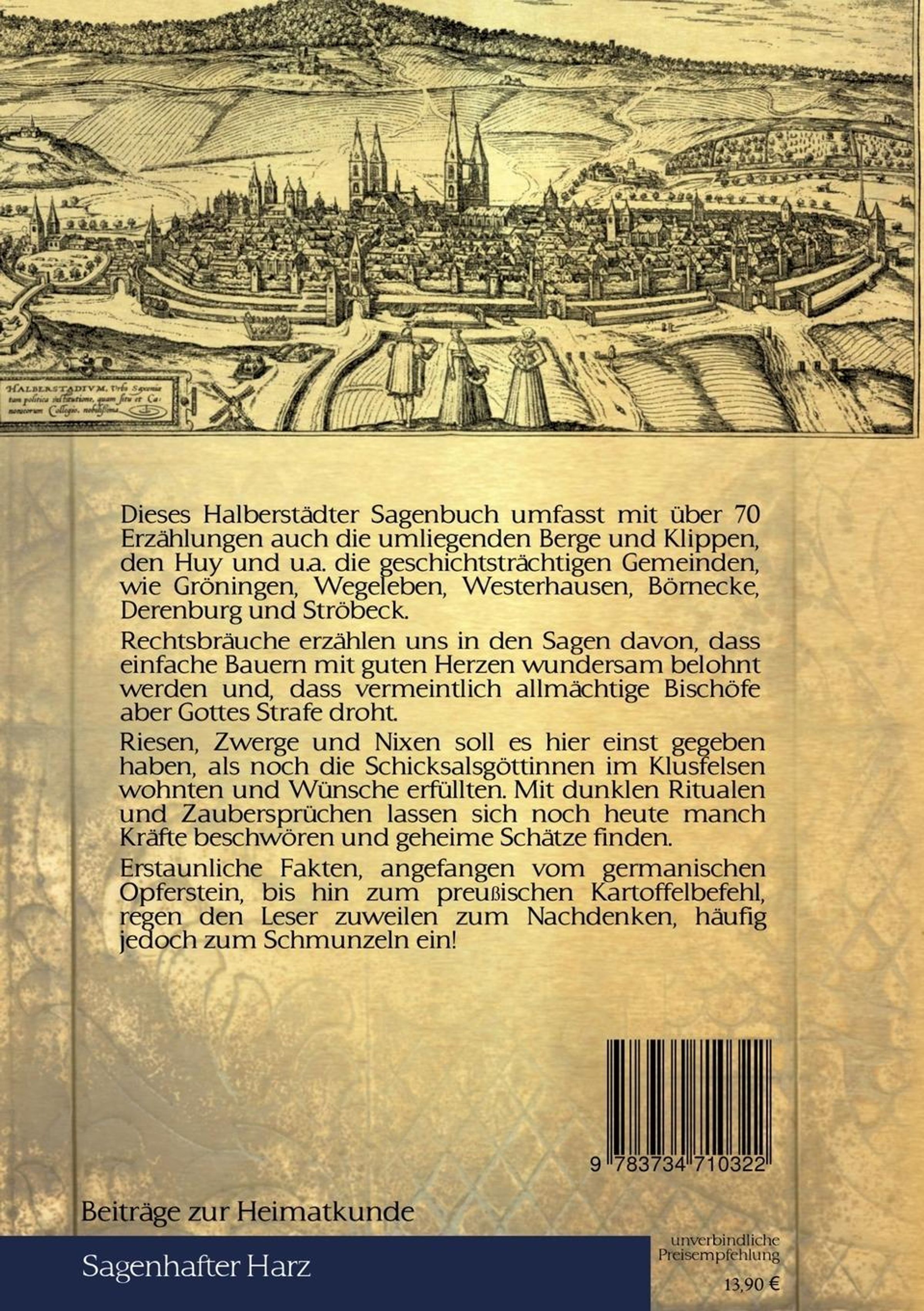 Dieses Halberstädter Sagenbuch umfasst mit über 70 Erzählungen auch die umliegenden Berge und Klippen, den Huy und u. a. die geschichtsträchtigen Gemeinden, wie Gröningen, Wegeleben, Westerhausen, Börnecke, Derenburg und Ströbeck. Rechtsbräuche erzählen uns in den Sagen davon, dass einfache Bauern mit guten Herzen wundersam belohnt werden und, dass vermeintlich allmächtige Bischöfe aber Gottes Strafe droht. Riesen, Zwerge und Nixen soll es hier einst gegeben haben, als noch die Schicksalsgöttinnen im Klusfelsen wohnten und Wünsche erfüllten. Mit dunklen Ritualen und Zaubersprüchen lassen sich noch heute manch Kräfte beschwören und geheime Schätze finden. Erstaunliche Fakten, angefangen vom germanischen Opferstein, bis hin zum preußischen Kartoffelbefehl, regen den Leser zuweilen zum Nachdenken, häufig jedoch zum Schmunzeln ein!