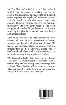 In "The Ghost of a Soul in Pain," the reader is invited into the haunting landscape of human sorrow and resilience. This collection of poignant verses explores the depths of emotional turmoil and the fragile threads that connect us to our essence. Through evocative imagery and haunting metaphors, the poet gives voice to the silent struggles that often linger beneath the surface, revealing the ghostly echoes of past heartbreaks and unspoken fears. Each poem serves as a delicate brushstroke on the canvas of the human experience, capturing moments of despair and glimmers of hope. The lyrical flow guides you through a journey that is as introspective as it is universal, urging you to confront the shadows within while seeking solace in the shared experience of pain and healing. "The Ghost of a Soul in Pain" is not just a reflection of sorrow; it is a testament to the strength found in vulnerability and the beauty that can emerge from sadness. This collection will resonate with anyone who has grappled with their inner demons and emerged, albeit scarred, into the light.