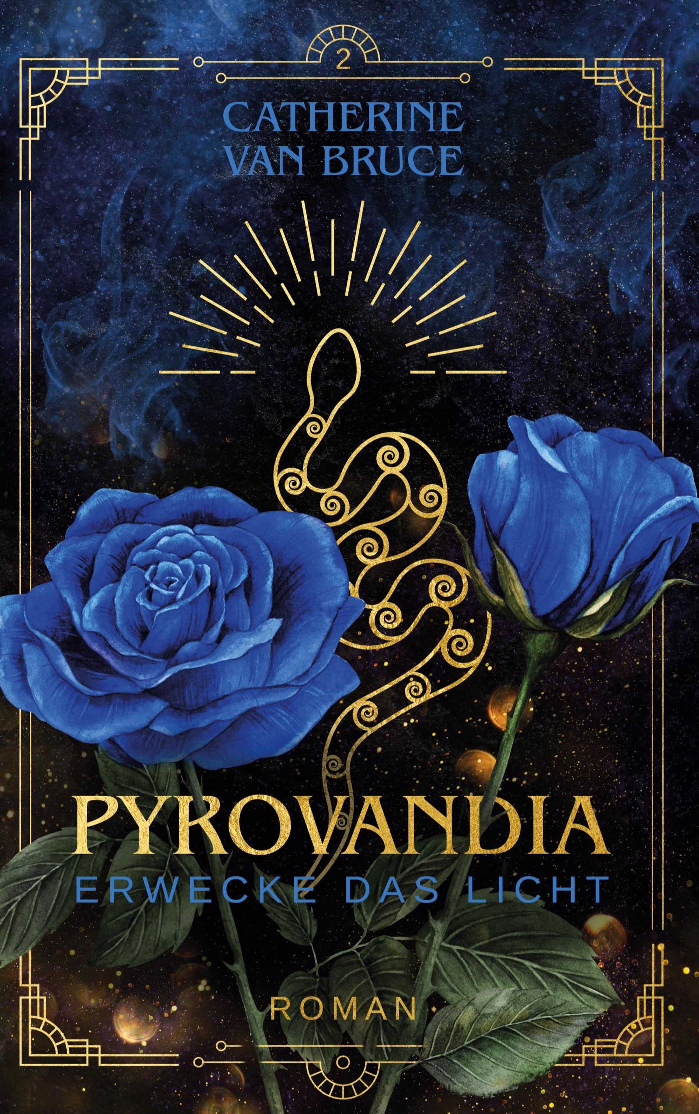 „Catherine Van Bruce“, „Pyrovandia“, „Erwecke das Licht“, „Roman“. Zwei blaue Rosen, goldene Schlange, Nachtthintergrund., Buch
