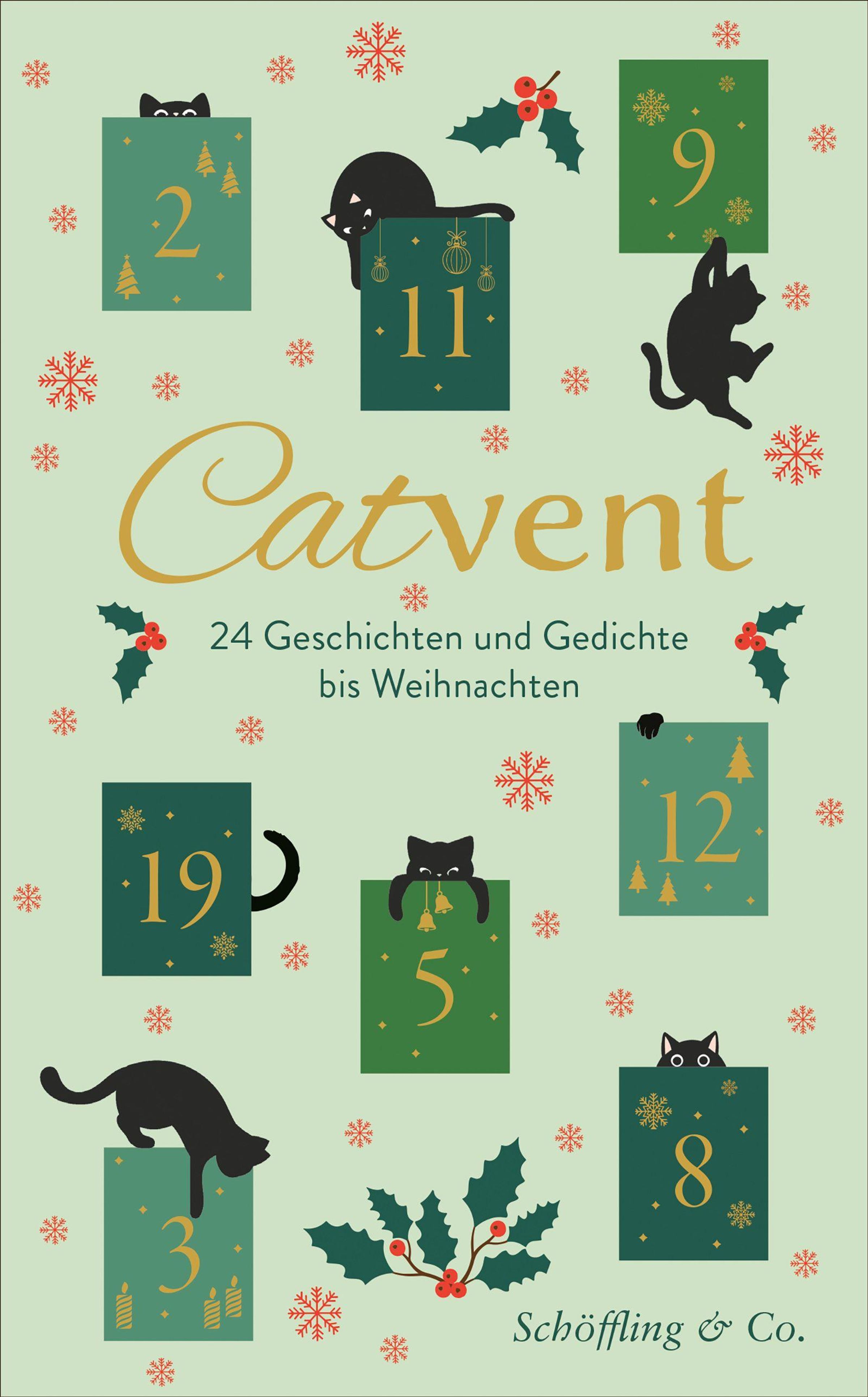 "Catvent: 24 Geschichten und Gedichte bis Weihnachten" steht auf einem Adventskalender mit Katzen und Weihnachtsmotiven., Buch