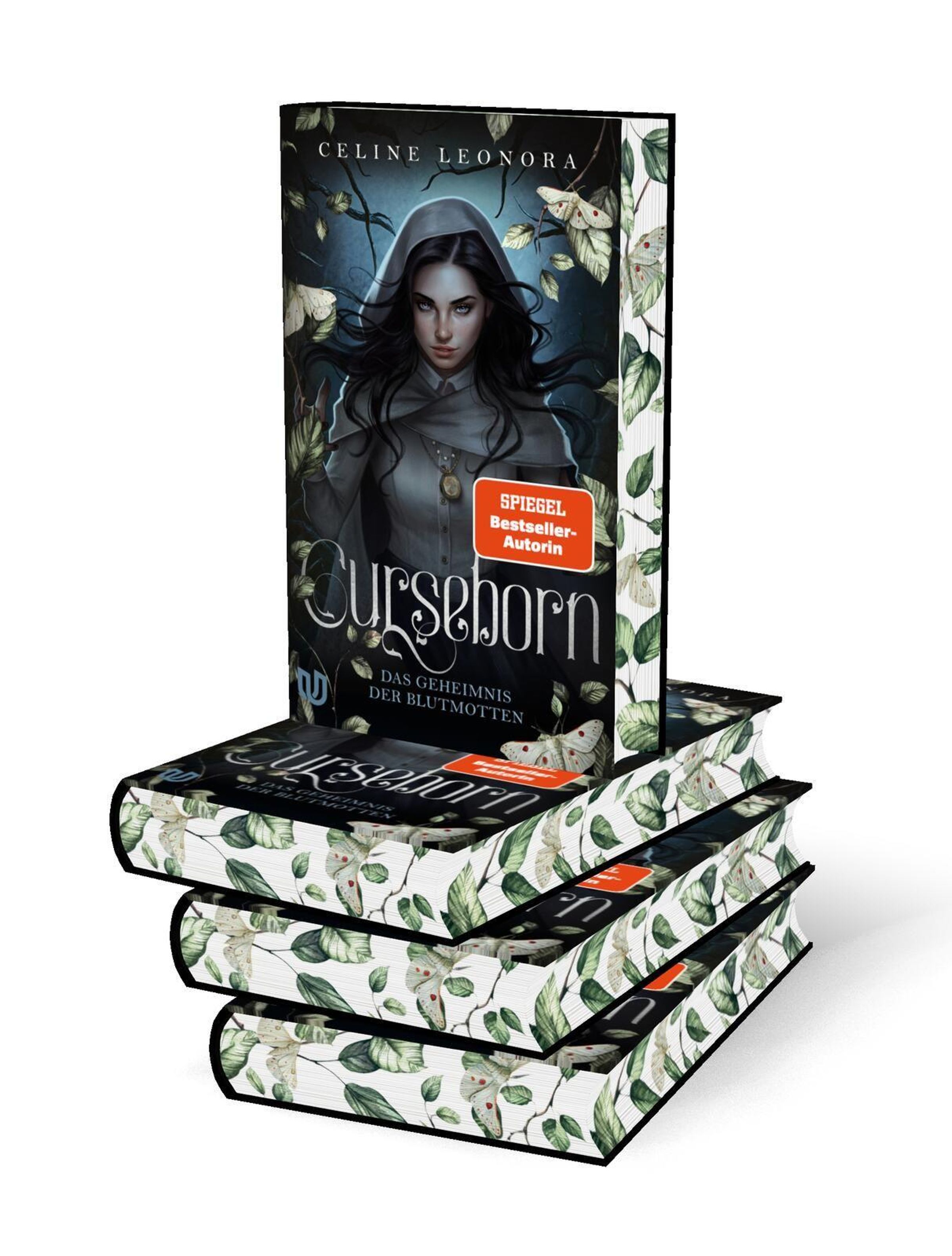 Text: Celine Leonora, Curseborn, Das Geheimnis der Blutmotten. Illustration: Eine Frau in einem Umhang mit Motten und Blättern., Buch