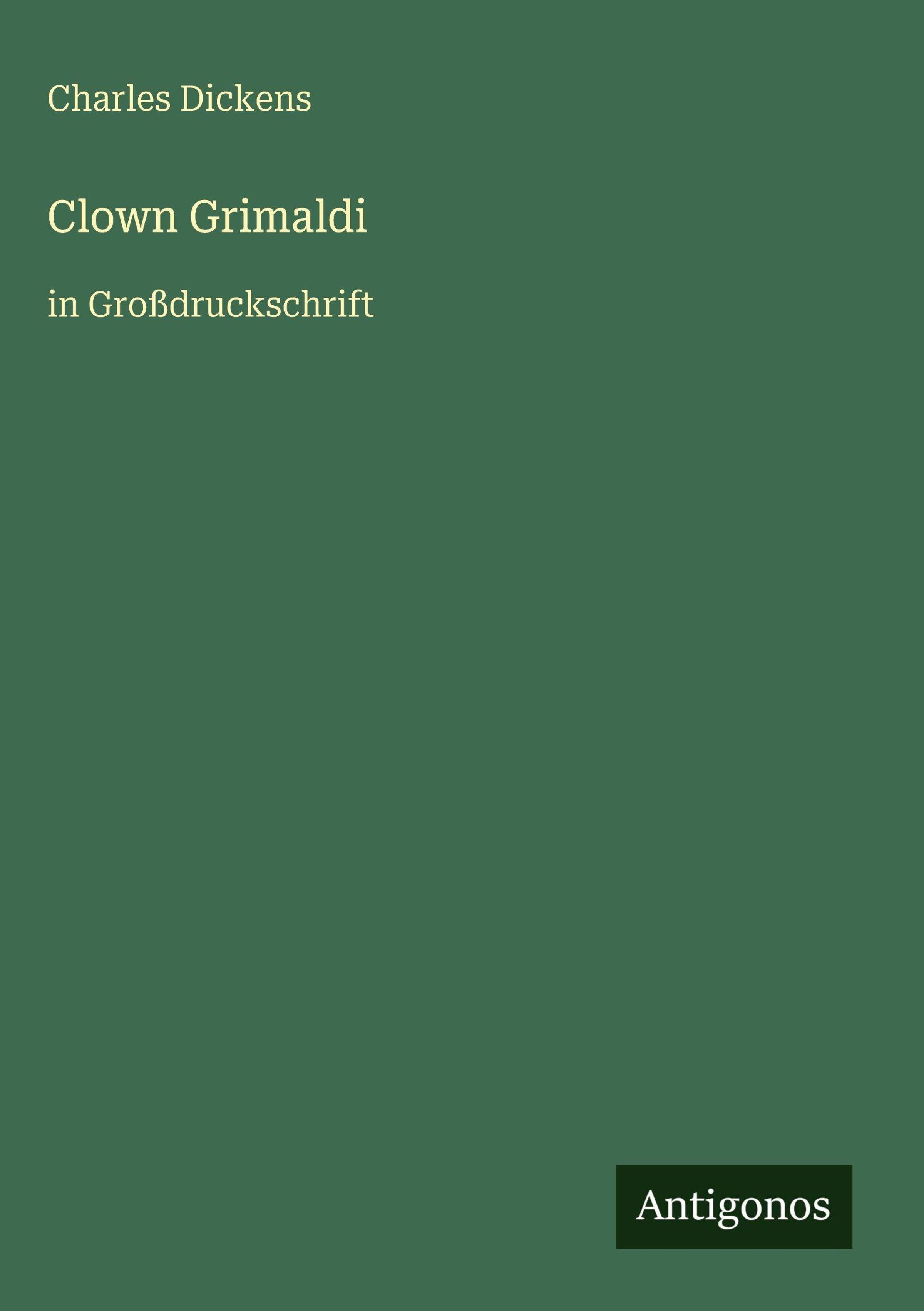 Text: "Charles Dickens, Clown Grimaldi in Großdruckschrift" oben links; "Antigonos" als Logo unten rechts. Hintergrund grün., Buch