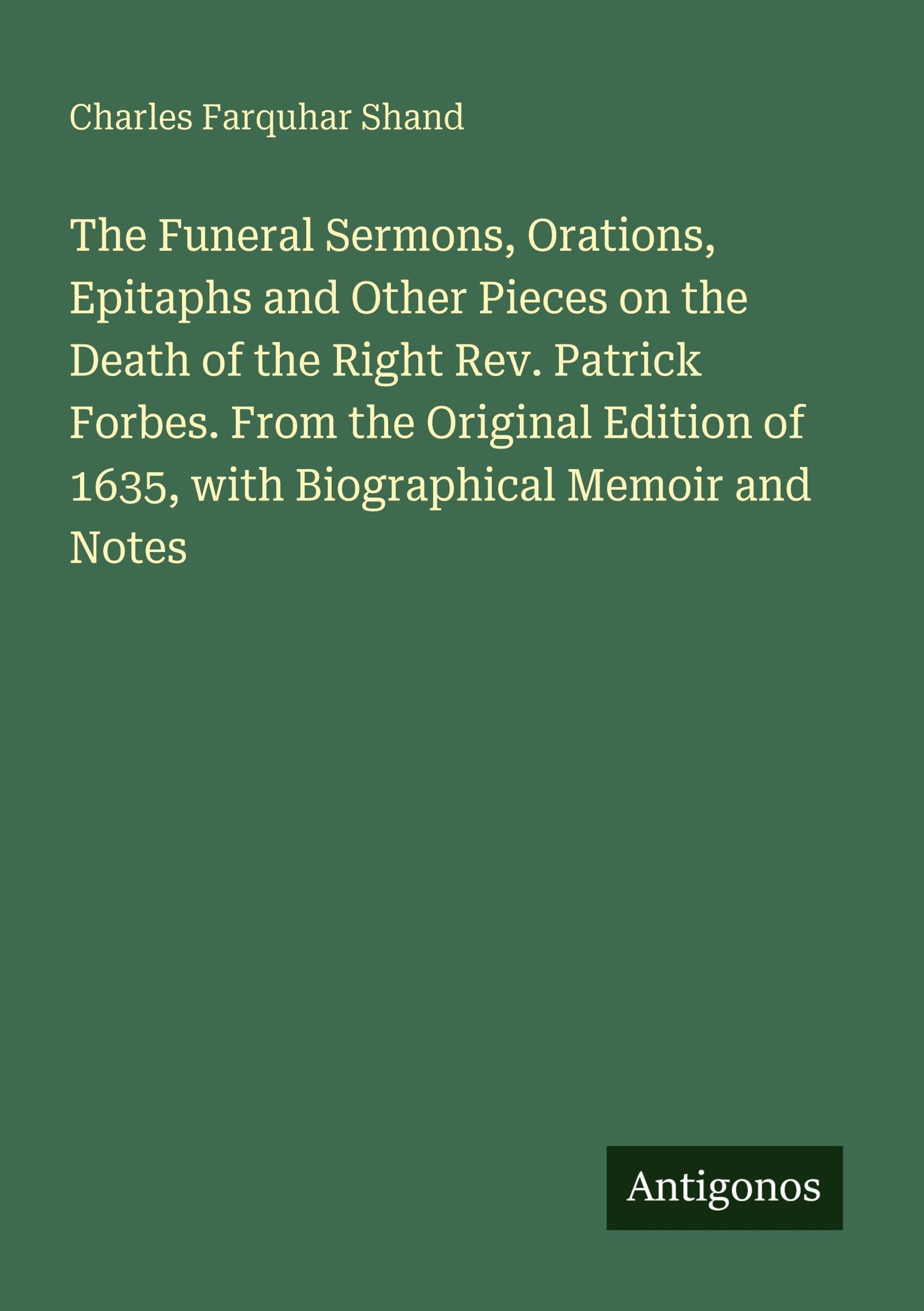 The Funeral Sermons, Orations, Epitaphs and Other Pieces on the Death of the Right Rev. Patrick Forbes. From the Original Edition of 1635, with Biographical Memoir and Notes