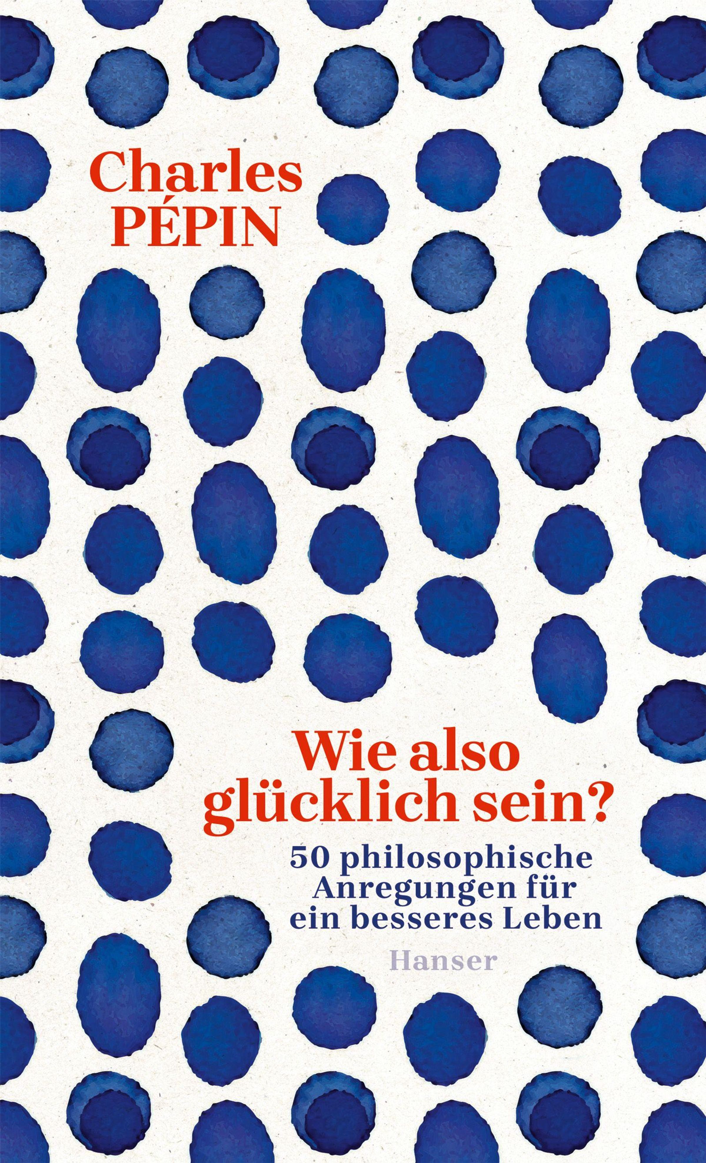 Texte: „Charles Pépin“, „Wie also glücklich sein? 50 philosophische Anregungen für ein besseres Leben“, „Hanser“. Hintergrund: blaue Punkte., Buch
