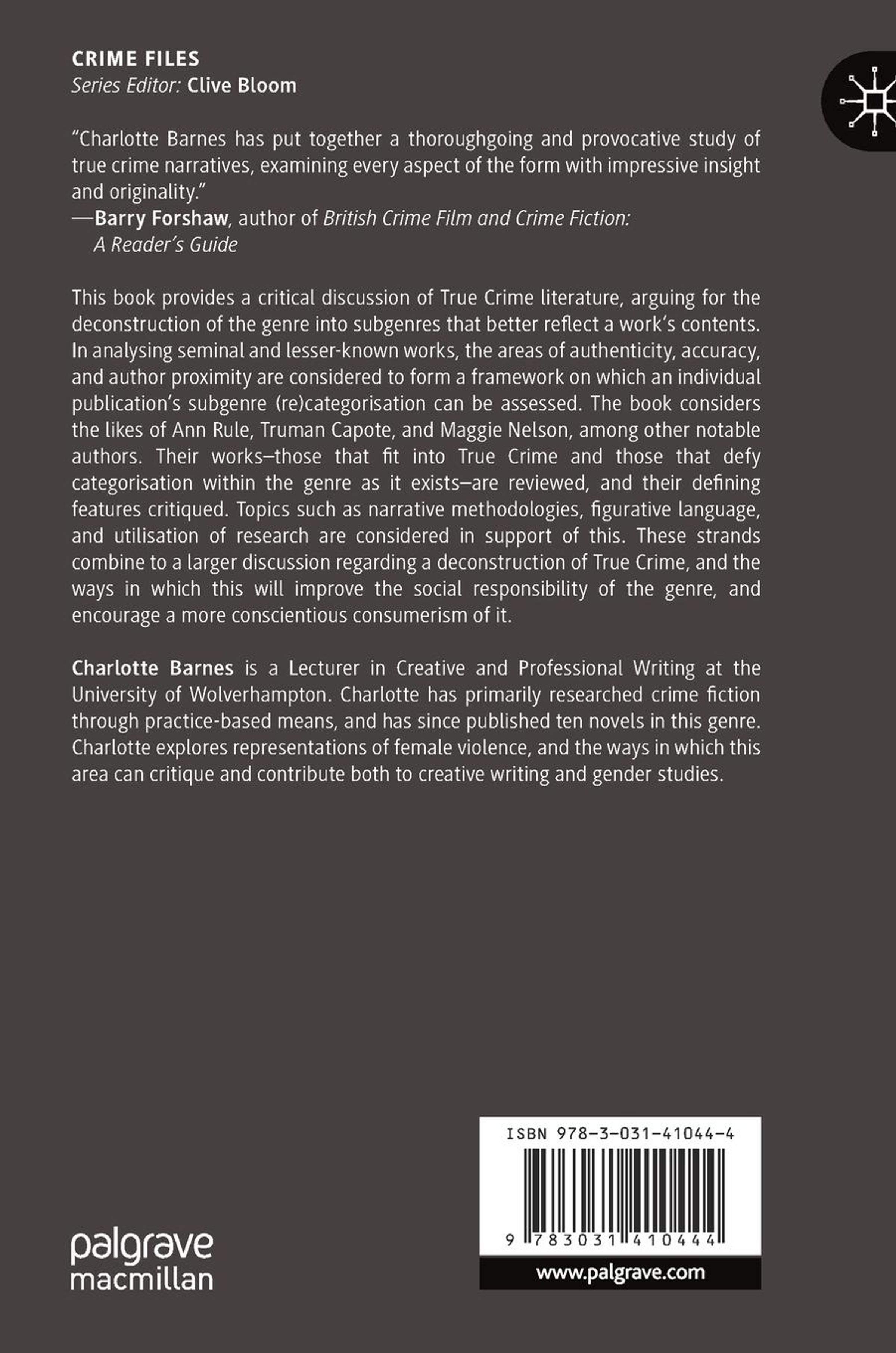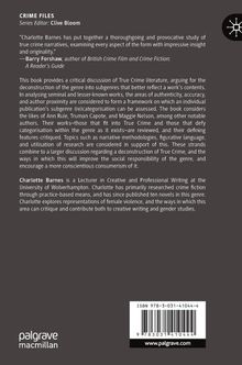 This book provides a critical discussion of True Crime literature, arguing for the deconstruction of the genre into subgenres that better reflect a works contents. In analysing seminal and lesser-known works, the areas of authenticity, accuracy, and author proximity are considered to form a framework on which an individual publications subgenre (re)categorisation can be assessed. The book considers the likes of Ann Rule, Truman Capote, and Maggie Nelson, among other notable authors. Their works those that fit into True Crime and those that defy categorisation within the genre as it exists are reviewed, and their defining features critiqued. Topics such as narrative methodologies, figurative language, and utilisation of research are considered in support of this. These strands combine to a larger discussion regarding a deconstruction of True Crime, and the ways in which this will improve the social responsibility of the genre, and encourage a more conscientious consumerism of it.