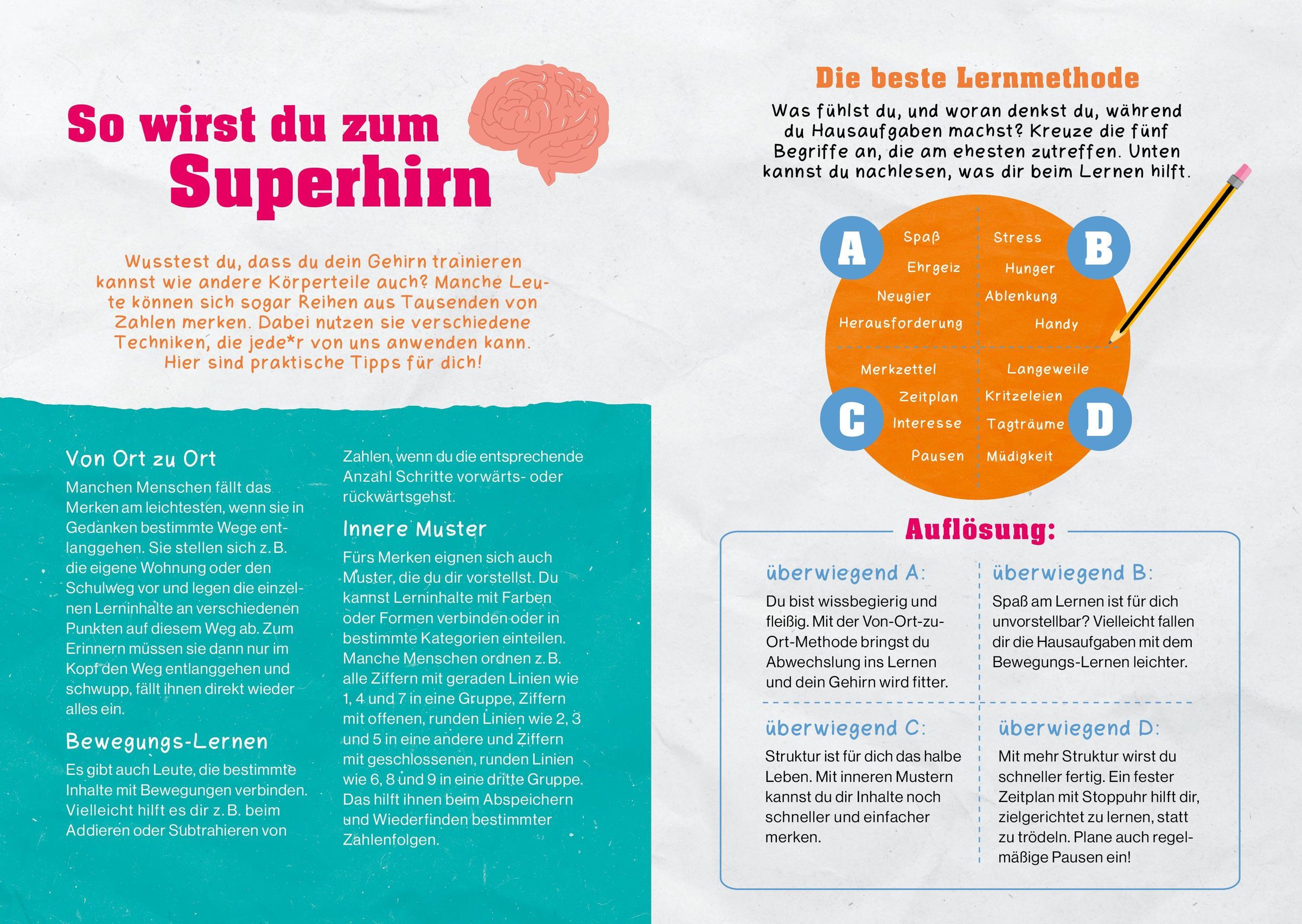 Finde in Test heraus, welcher Sport- oder Kreativ-Typ du bist, bringe deine Freund*innen mit verblüffenden Mathe-Tricks zum Staunen, werde mit dem Lern-Check zum Superhirn, entdecke praktische Survival-Tipps für die Ferien und vieles mehr.