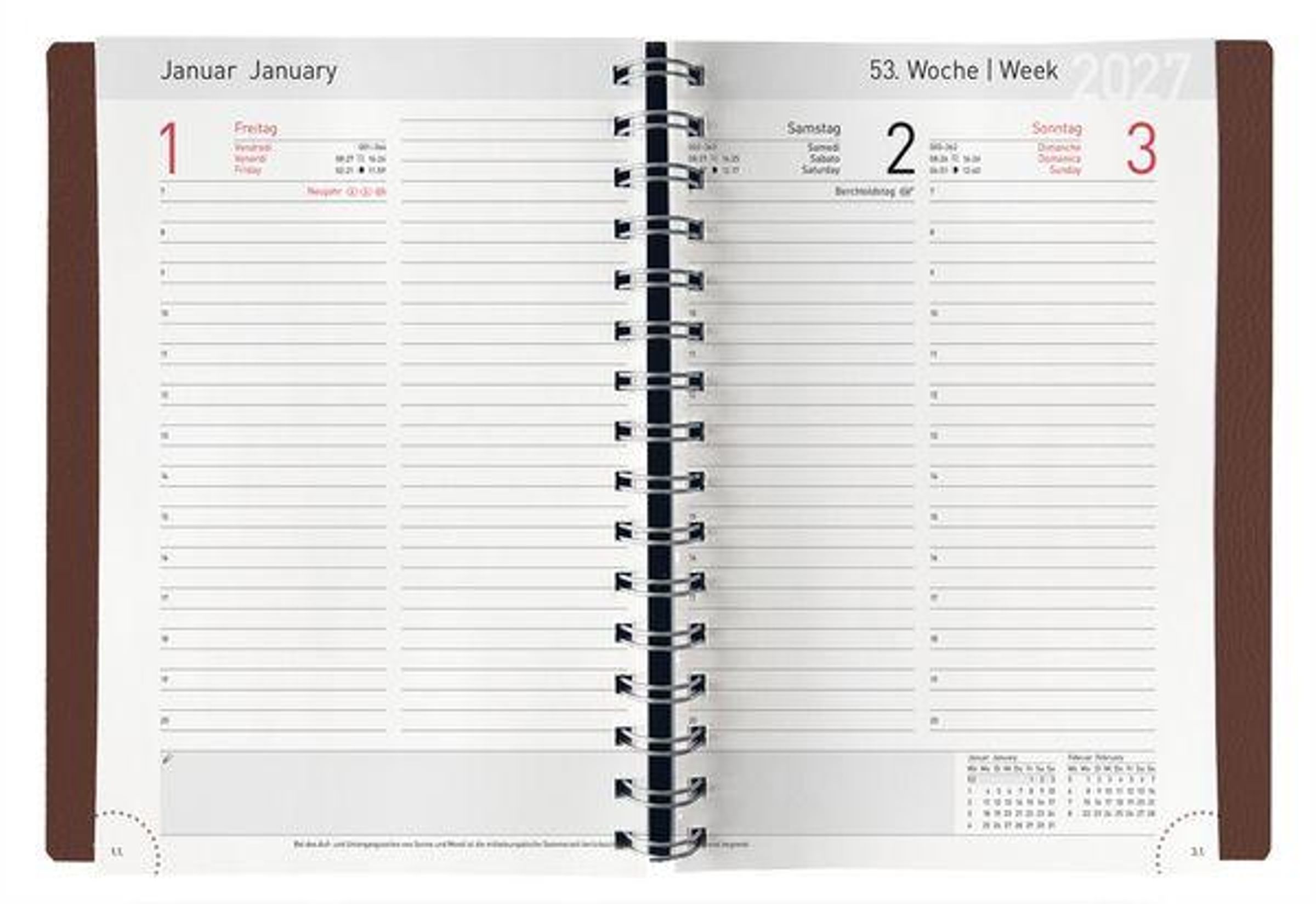 Moderner Buchkalender mit praktischer Spiralbindung und hochwertigem Einband aus braunem Leder. Pro Wochentag eine Seite, Sa / So eine Seite. Kalendarium: D/E/F/I.