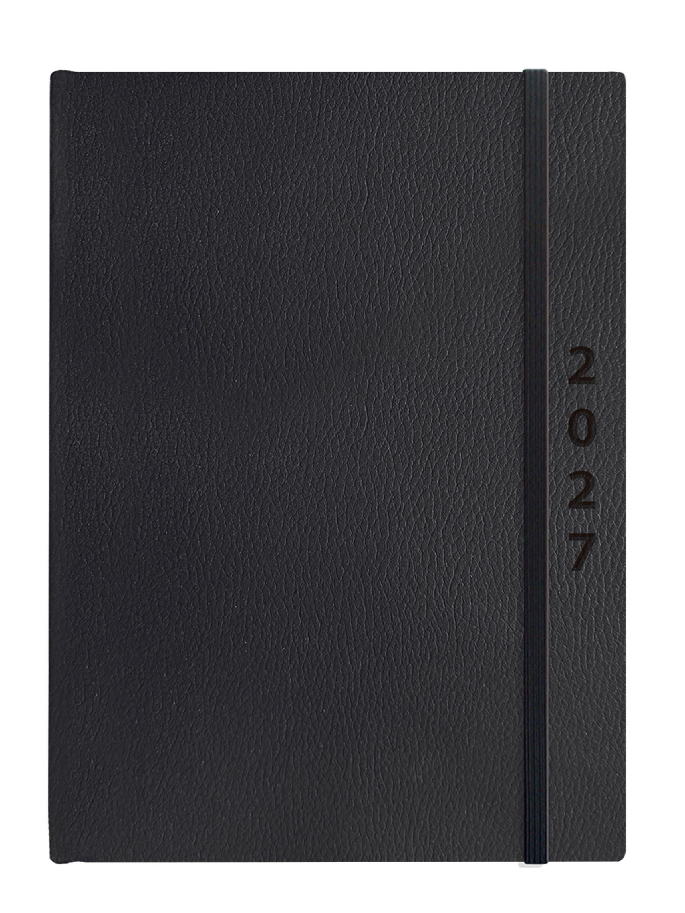 Moderner Buchkalender mit praktischer Spiralbindung und hochwertigem Einband aus schwarzem Leder. Pro Wochentag eine Seite, Sa / So eine Seite. Kalendarium: D/E/F/I.