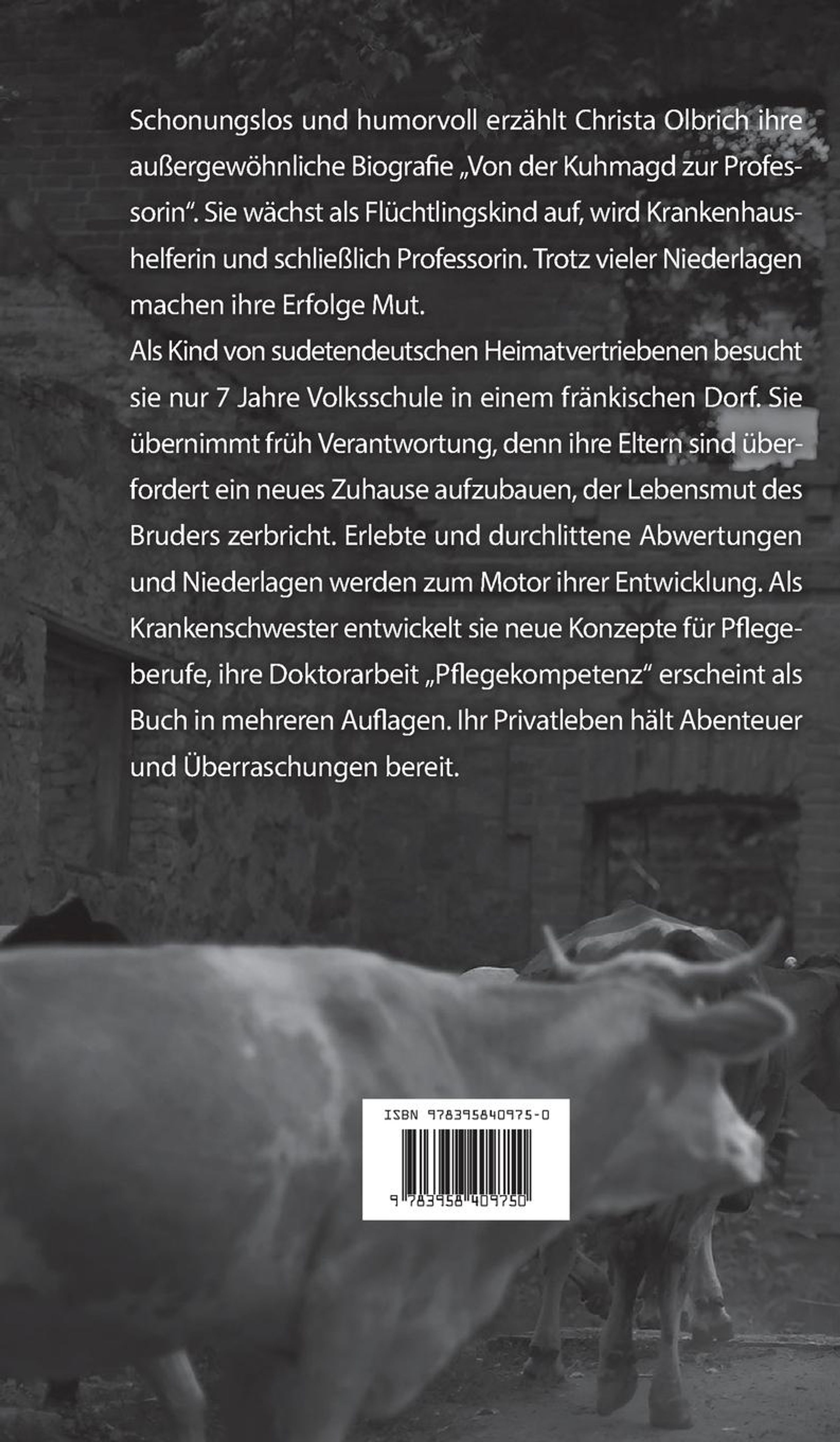 Schonungslos und humorvoll erzählt Christa Olbrich ihre außergewöhnliche Biografie ¿Von der Kuhmagd zur Professorin¿. Sie wächst als Flüchtlingskind auf, wird Krankenhaushelferin und schließlich Professorin. Trotz vieler Niederlagen machen ihre Erfolge Mut.