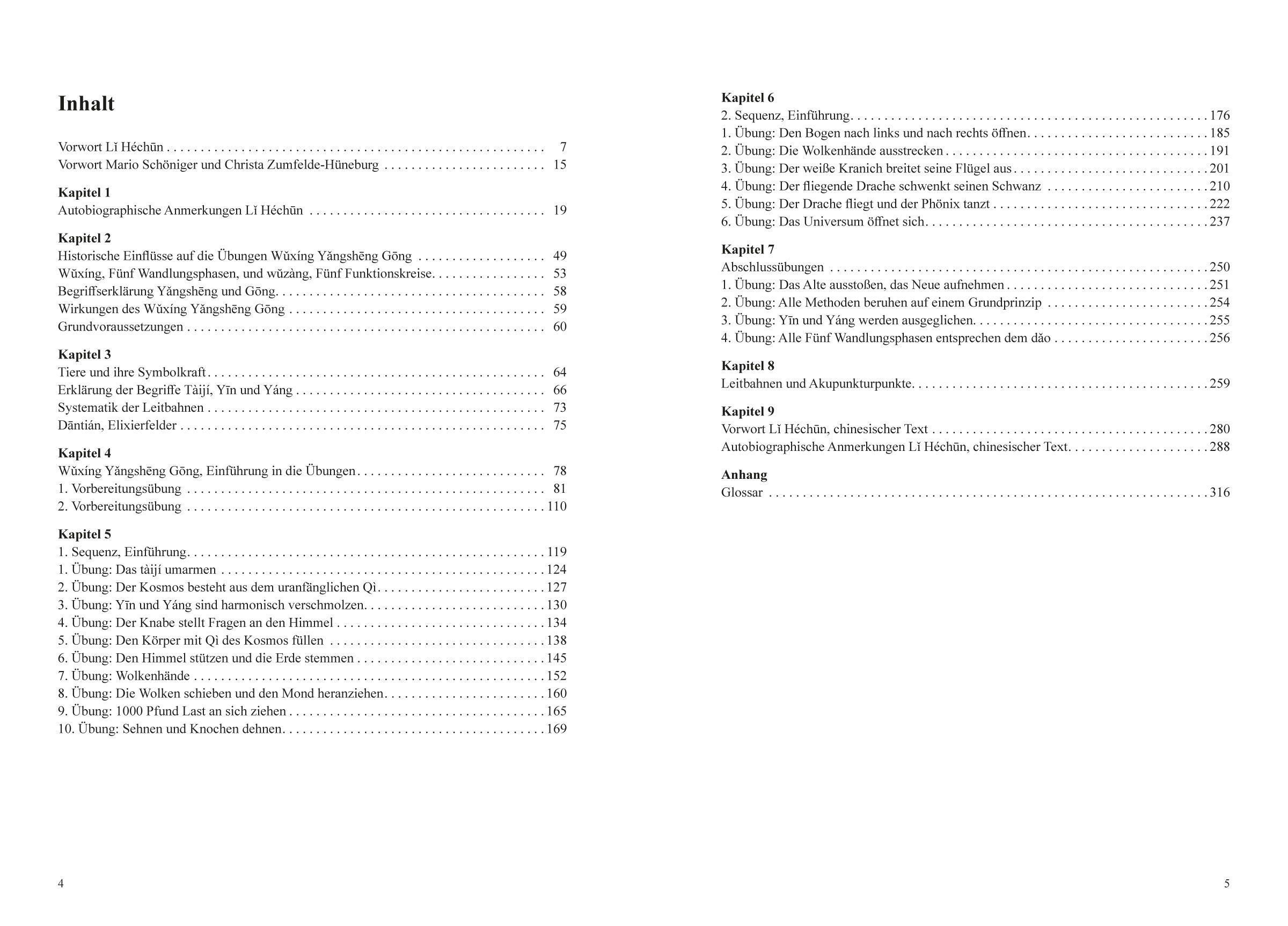 Dem Übungsteil vorangestellt sind ein Vorwort von Abt Li Hechun sowie autobiographische Anmerkungen, die seinen daoistischen Lebensweg und für ihn wichtige Meister beschreiben, ergänzt durch zahlreiche daoistische Zitate. Der chinesische Originaltext wurde in das Buch aufgenommen.