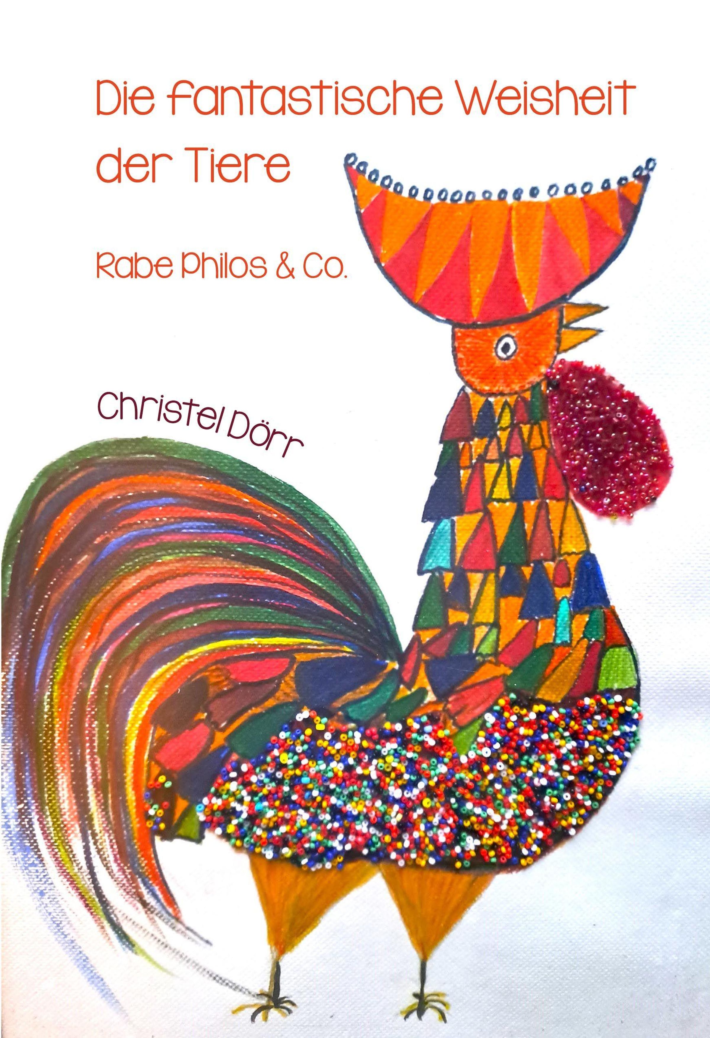 "Die fantastische Weisheit der Tiere. Rabe Philos & Co. Christel Dörr." Illustration: Bunter Hahn mit farbenfrohen Federn., Buch