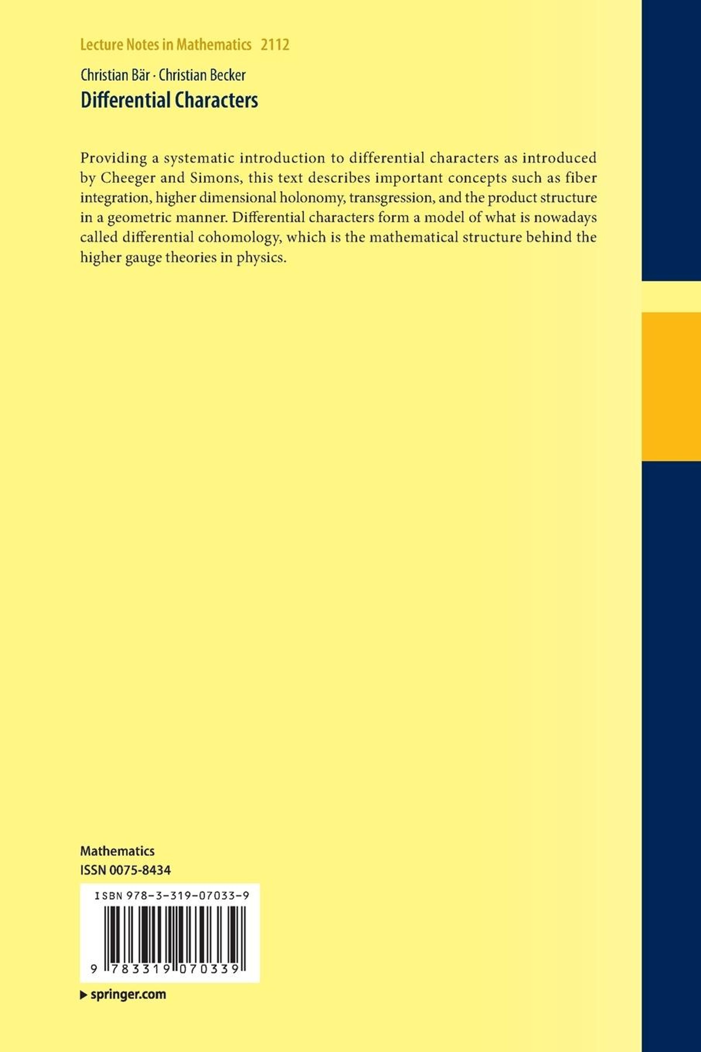 Providing a systematic introduction to differential characters as introduced by Cheeger and Simons, this text describes important concepts such as fiber integration, higher dimensional holonomy, transgression, and the product structure in a geometric manner. Differential characters form a model of what is nowadays called differential cohomology, which is the mathematical structure behind the higher gauge theories in physics.