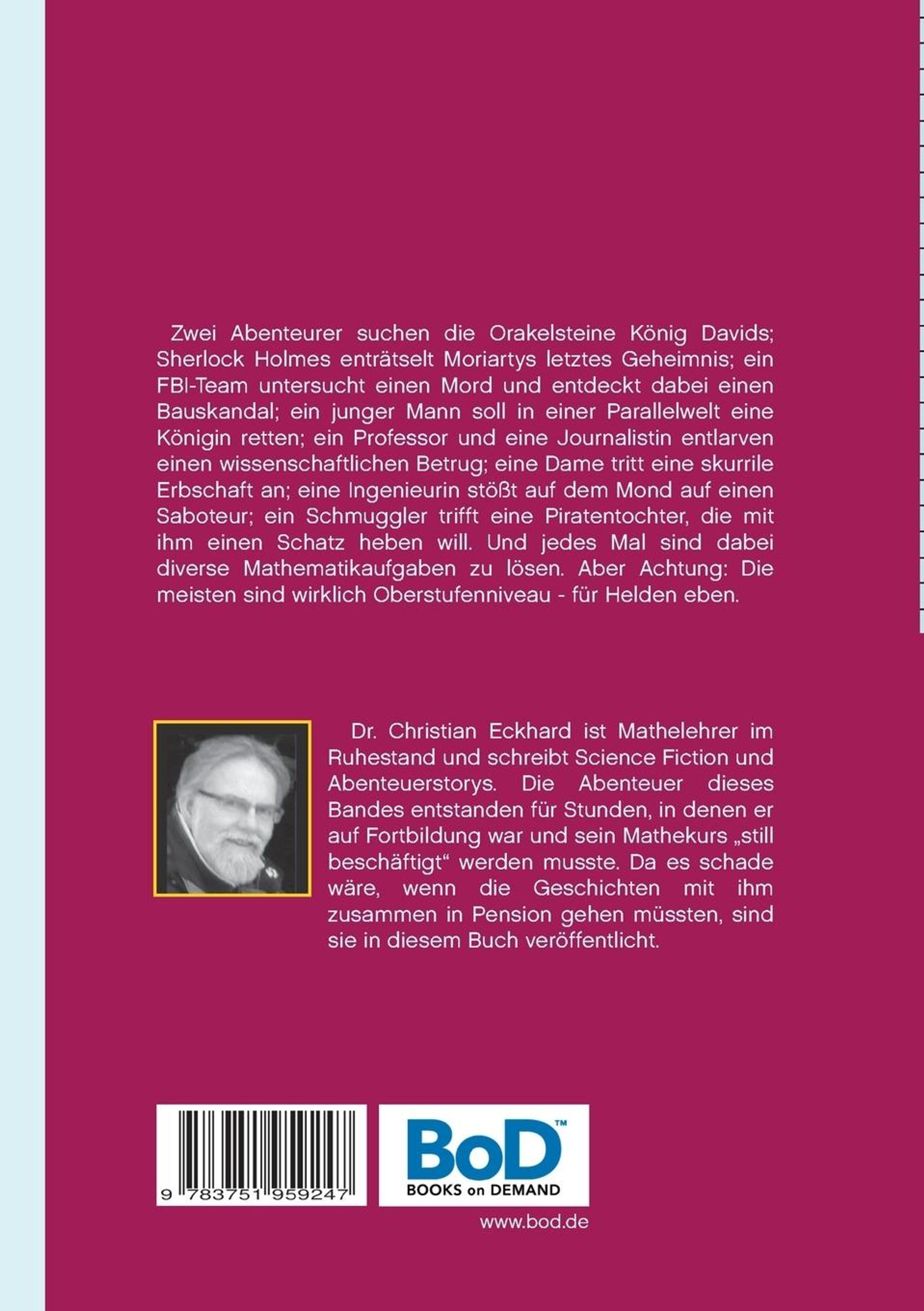 Zwei Abenteurer suchen die Orakelsteine König Davids; Sherlock Holmes enträtselt Moriartys letztes Geheimnis; ein FBI-Team untersucht einen Mord und entdeckt dabei einen Bauskandal; ein junger Mann soll in einer Parallelwelt eine Königin retten; ein Professor und eine Journalistin entlarven einen wissenschaftlichen Betrug; eine Dame tritt eine skurrile Erbschaft an; eine Ingenieurin stößt auf dem Mond auf einen Saboteur; ein Schmuggler trifft eine Piratentochter, die mit ihm einen Schatz heben will. Und jedes Mal sind dabei diverse Mathematikaufgaben zu lösen. Aber Achtung: Die meisten sind wirklich Oberstufenniveau - für Helden eben. Die Abenteuergeschichten entstanden in der aktiven Zeit des Autors als Gymnasiallehrer, um seine Mathematikkurse unterhaltsam und sinnvoll zu beschäftigen, wenn er infolge Fortbildung den Unterricht nicht wie gewohnt abhalten konnte.