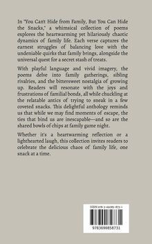 In "You Can't Hide from Family, But You Can Hide the Snacks," a whimsical collection of poems explores the heartwarming yet hilariously chaotic dynamics of family life. Each verse captures the earnest struggles of balancing love with the undeniable quirks that family brings, alongside the universal quest for a secret stash of treats. With playful language and vivid imagery, the poems delve into family gatherings, sibling rivalries, and the bittersweet nostalgia of growing up. Readers will resonate with the joys and frustrations of familial bonds, all while chuckling at the relatable antics of trying to sneak in a few coveted snacks. This delightful anthology reminds us that while we may find moments of escape, the ties that bind us are inescapable-and so are the shared bowls of chips at family game night. Whether it's a heartwarming reflection or a lighthearted laugh, this collection invites readers to celebrate the delicious chaos of family life, one snack at a time.