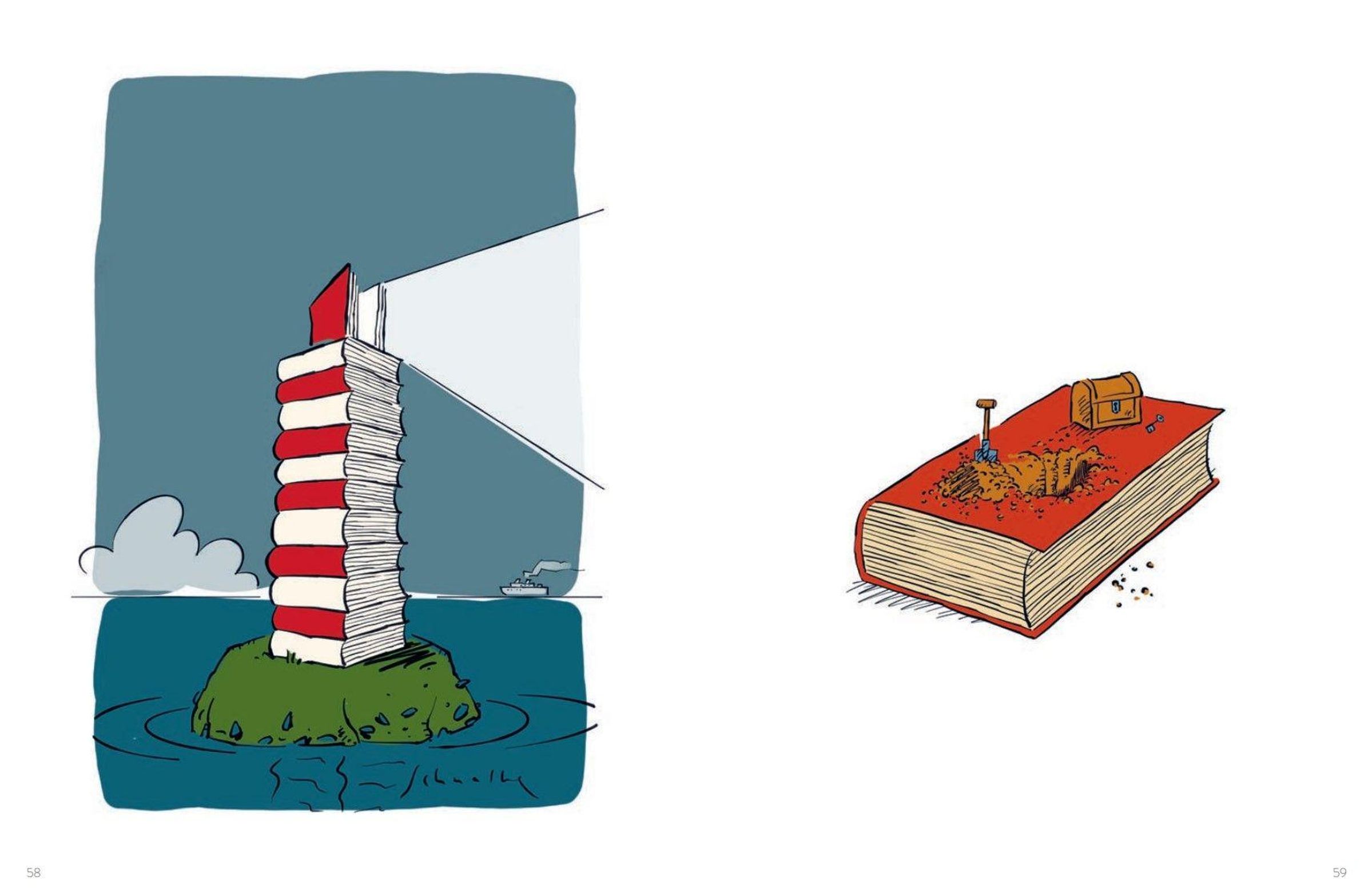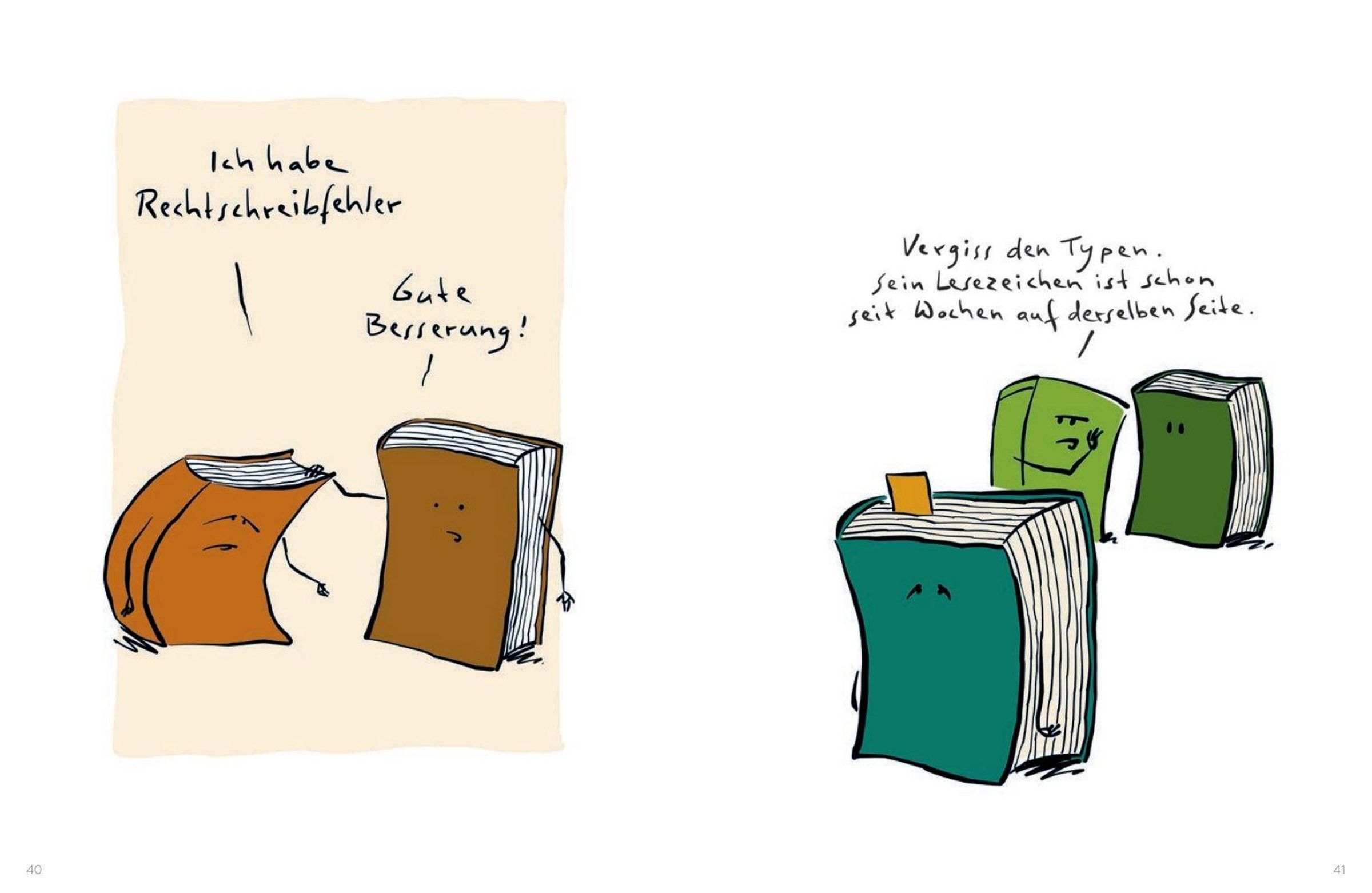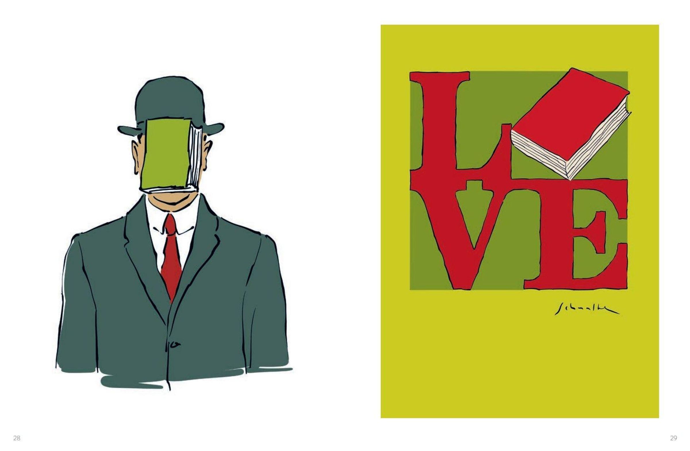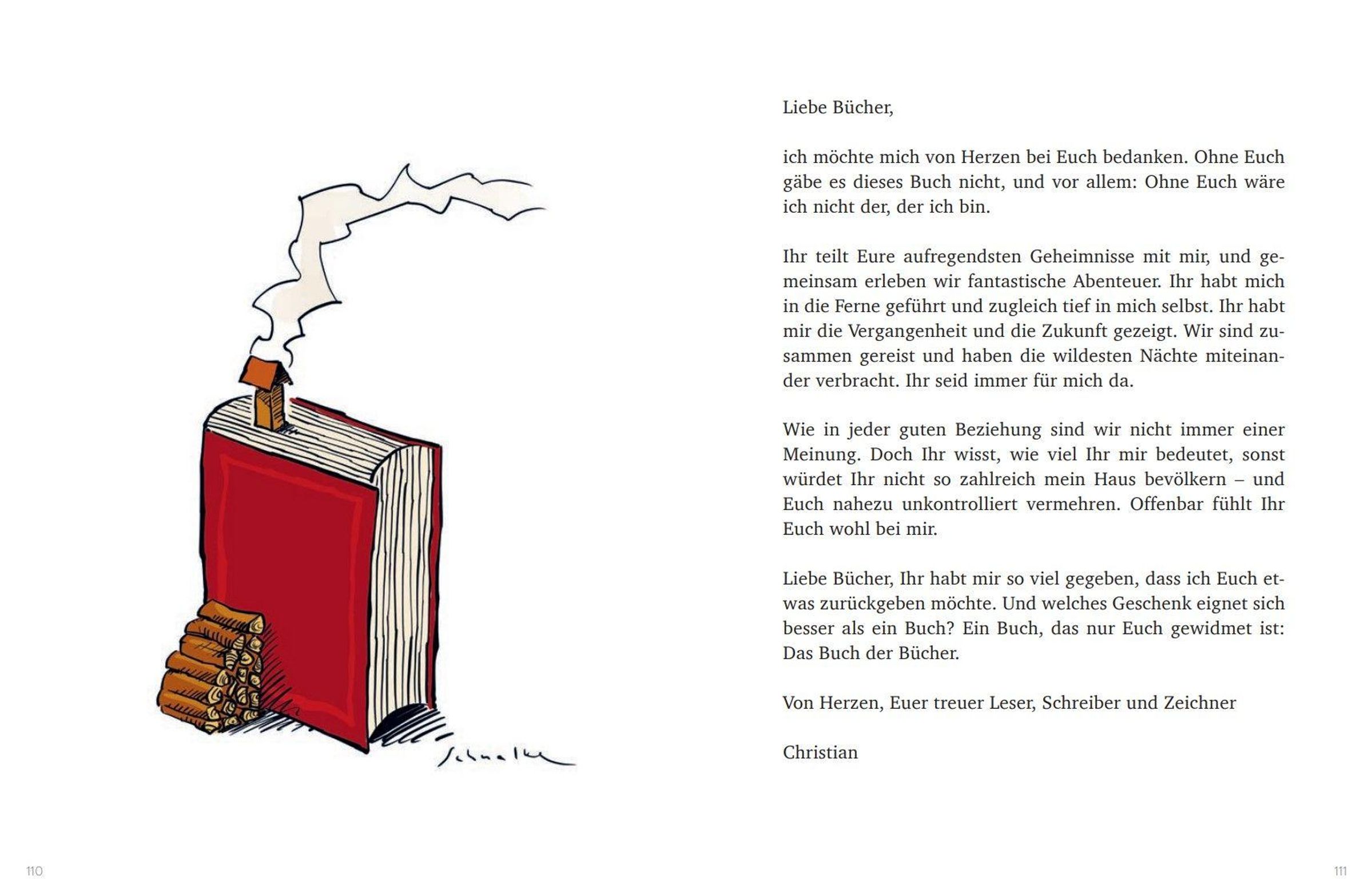 Wie wir wissen, stecken zwischen zwei Buchdeckeln ganze Welten, die sich erkunden lassen. Christian Schnalke schafft es, die Magie des Lesens mit seinen Illustrationen offenzulegen. Zudem lässt der Illustrator mit sicheren Strichen seine gezeichneten Bücher zu liebenswerten Protagonisten werden. Sie sind neugierig, mutig, schüchtern oder auch mal sturzbetrunken. Mit einem Augenzwinkern und einem guten Gespür für die Pointe setzt er sie in humorvollen Cartoons in Szene. Eine Hommage an den besten Freund des Menschen: das Buch.