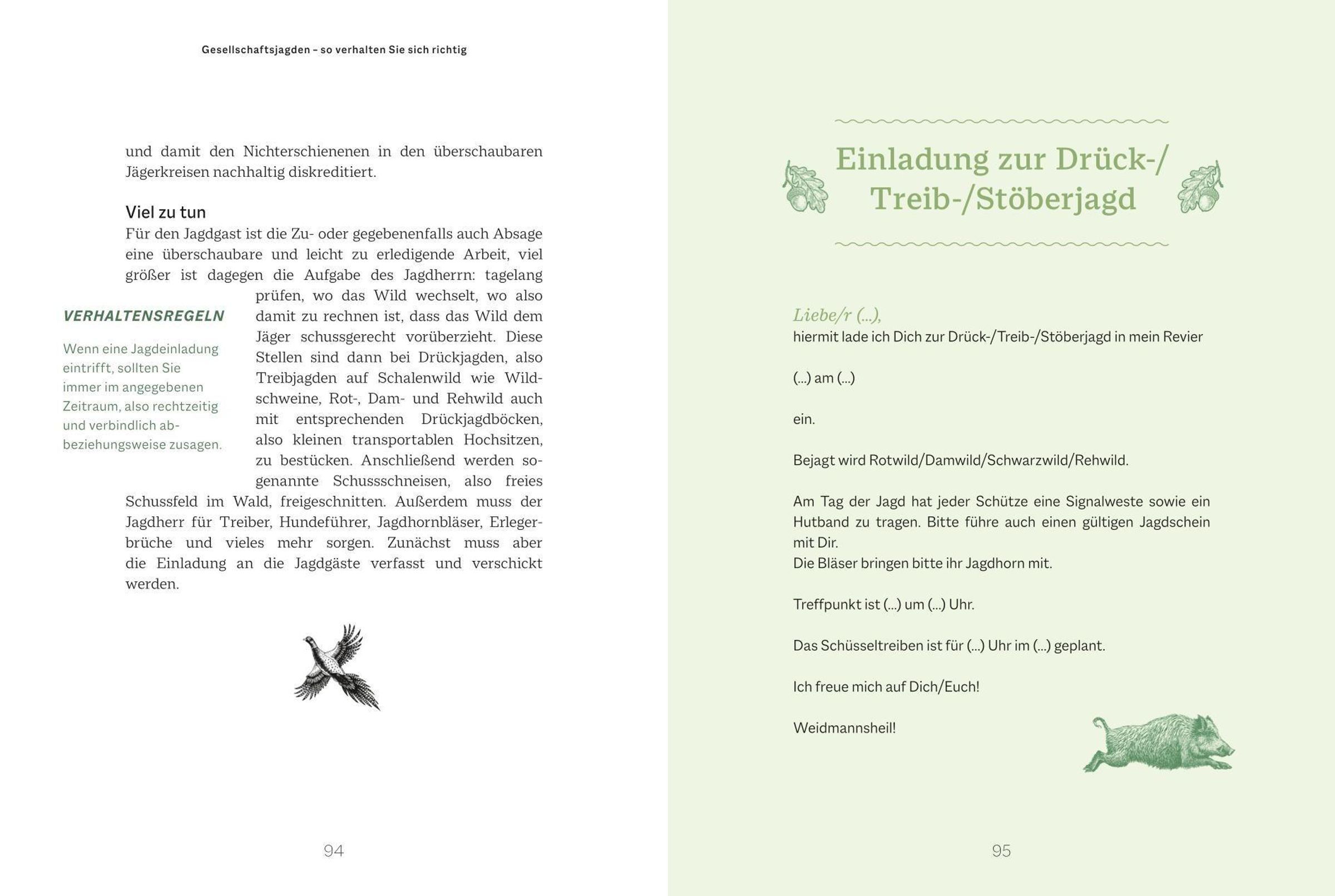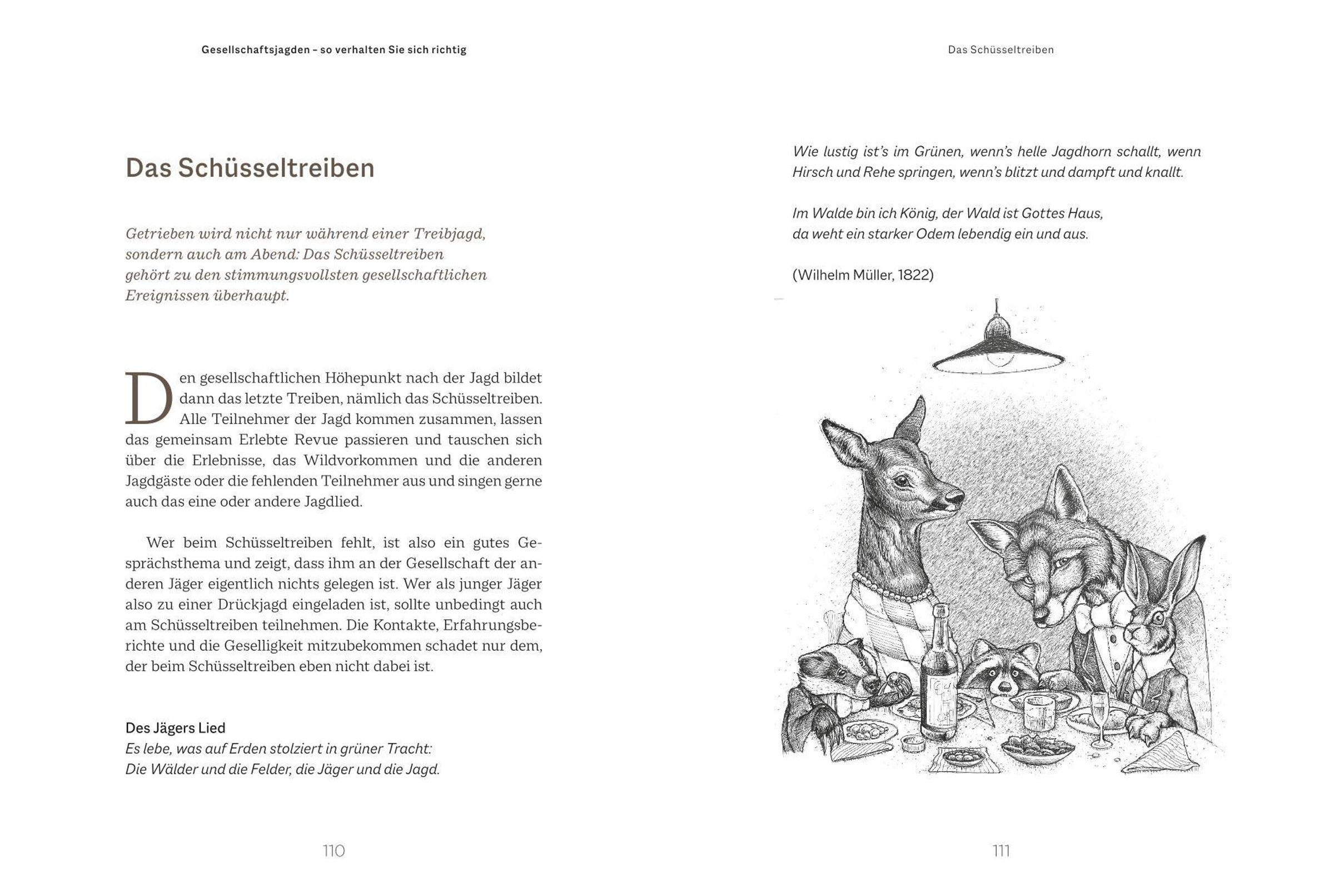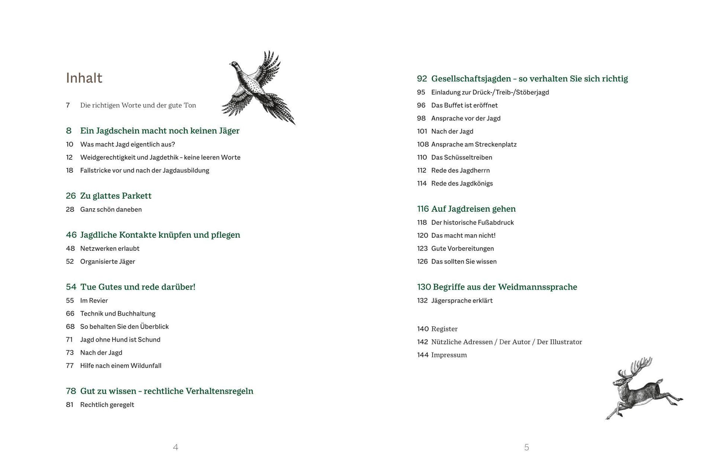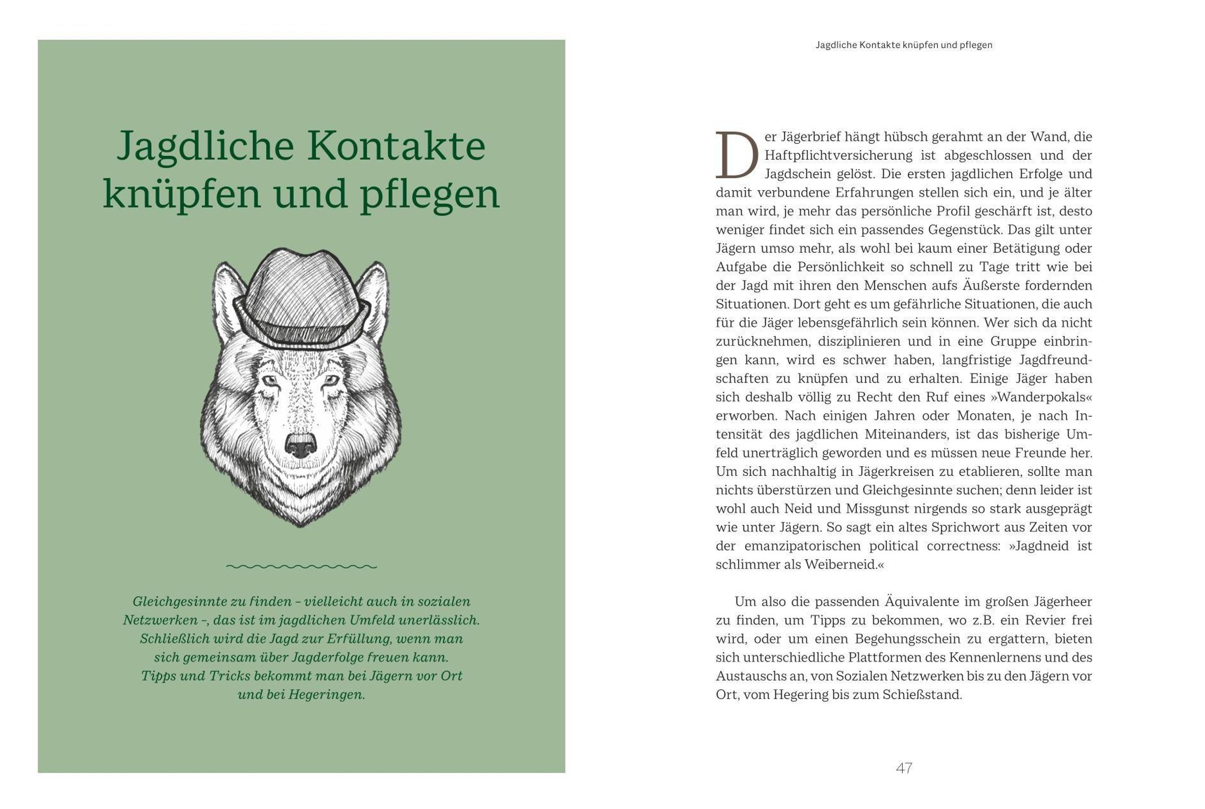 Wie verhalte ich mich bei alltäglichen Begegnungen mit anderen Jägern, aber auch mit Jagdgästen und anderen Nichtjägern wie Landwirten, Förstern, Joggern, Pilzesuchern oder anderen Waldbesuchern? Wie werde ich zu Jagden eingeladen? Welches Verhalten wird dabei durch das ungeschriebene Regelwerk der Jägerschaft von mir erwartet? Wie funktioniert eine Gesellschaftsjagd? Was muss ich als junger Jagdpächter wissen, der erstmals selbst eine eine solche Jagd organisiert? Wie laufen Jagdreisen ab und was muss ich beachten?